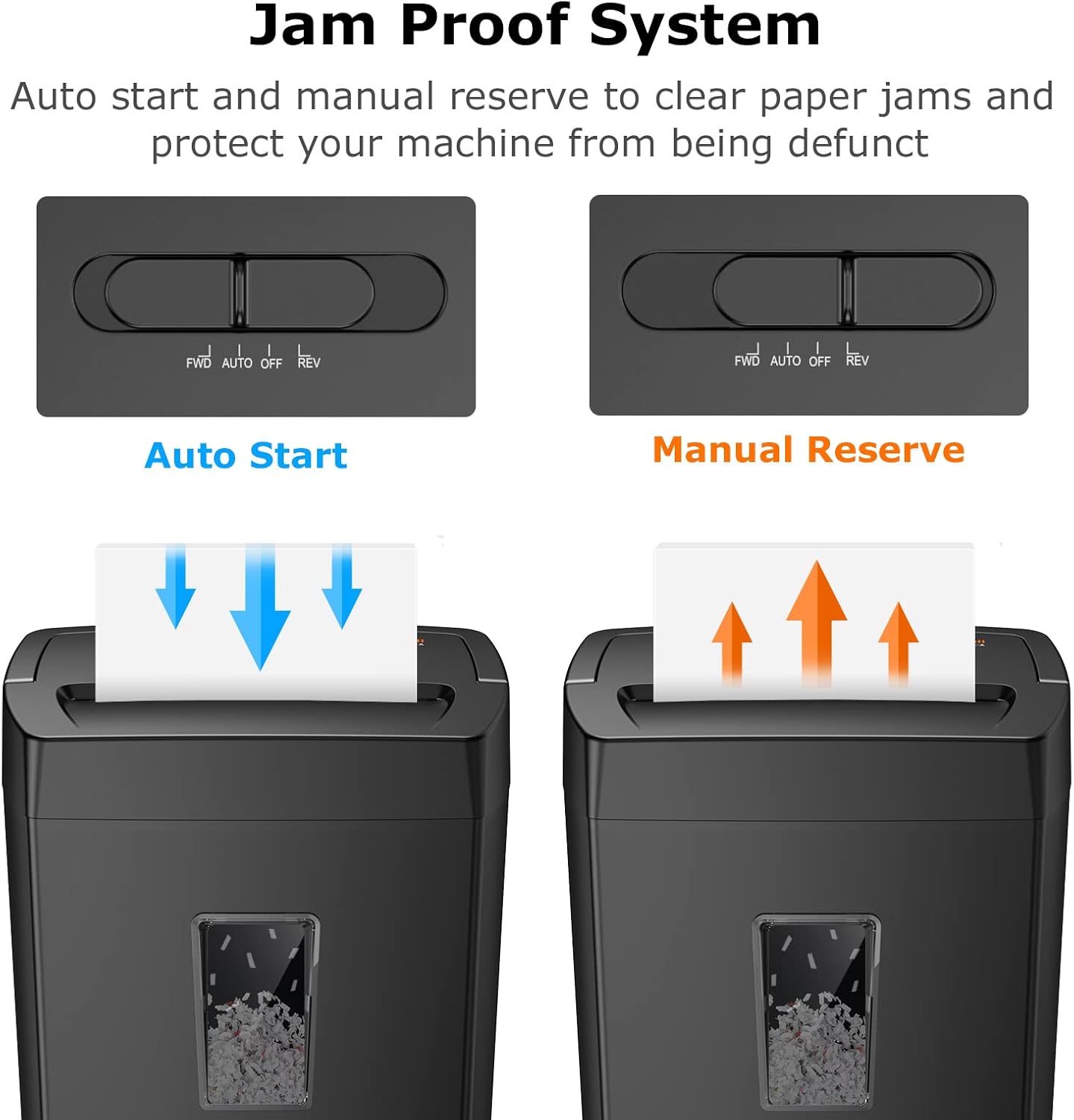 - 【Easy Operation & Safe Protection】Auto start/stop and manual-forward/reverse function protect the paper shredder heavy duty from the frustration of paper jams. Overheat protection helps you use paper shredder without worrying and prolong its lifetime. The document shredder will stop working once lift the head, keeping you safe.Important Note: We test every shredder before shipping, which means you may see some paper shreds from the testing.