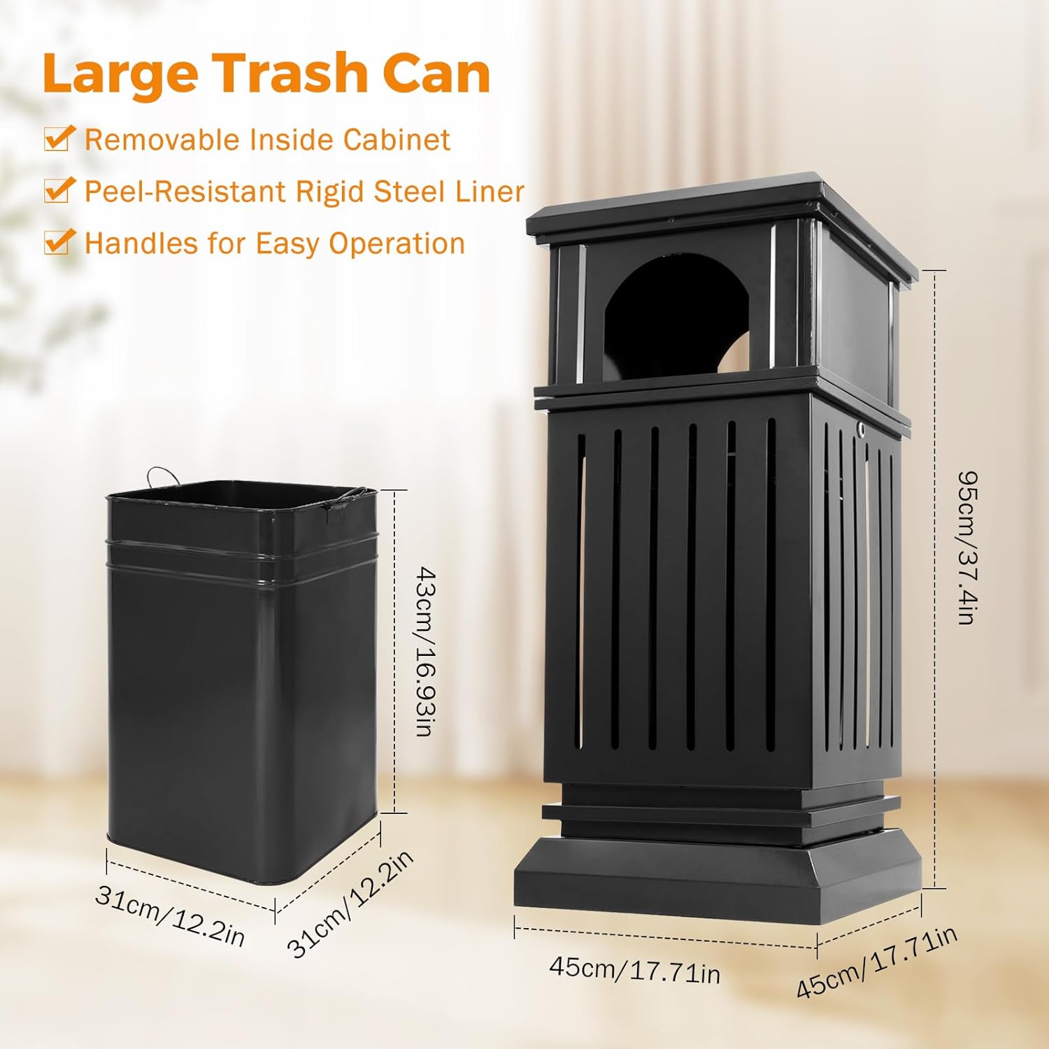 - MODERN STYLE - BEAMNOVA Black Stainless-Steel Trash Can with Ash Tray features stylish perforated panels, two convenient openings, and a top tray that enhances high traffic areas while keeping them clean and litter-free. Suitable for commercial indoor or outdoor places, such as patio, park, lobby, mall, yard, garage, office, hall, etc.