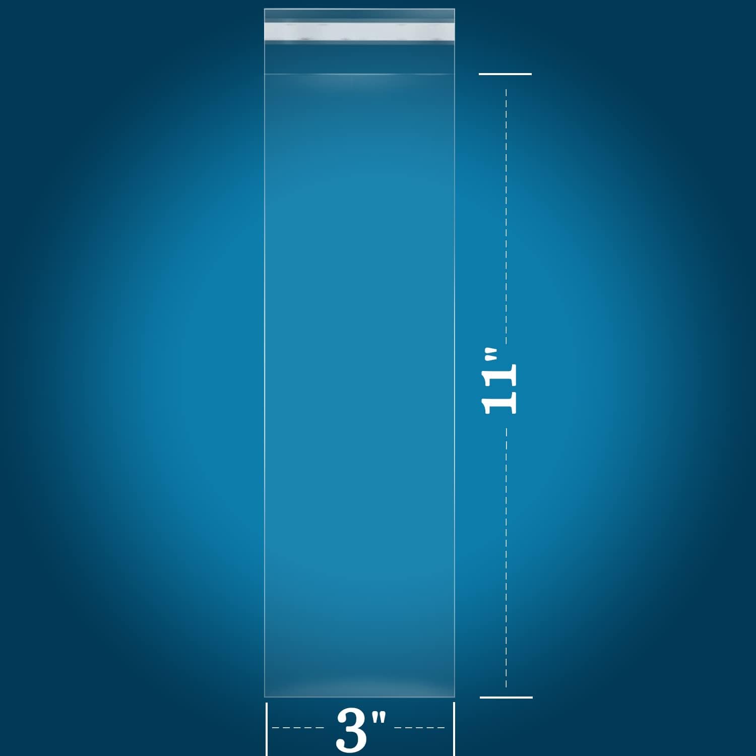 - [SPECIFICATION]: 200 PCS - 3" x 11"(Excludes Glue Flap) Resealable Cellophane Style Bags - Self Sealing. 1.4 Mil Thickness.