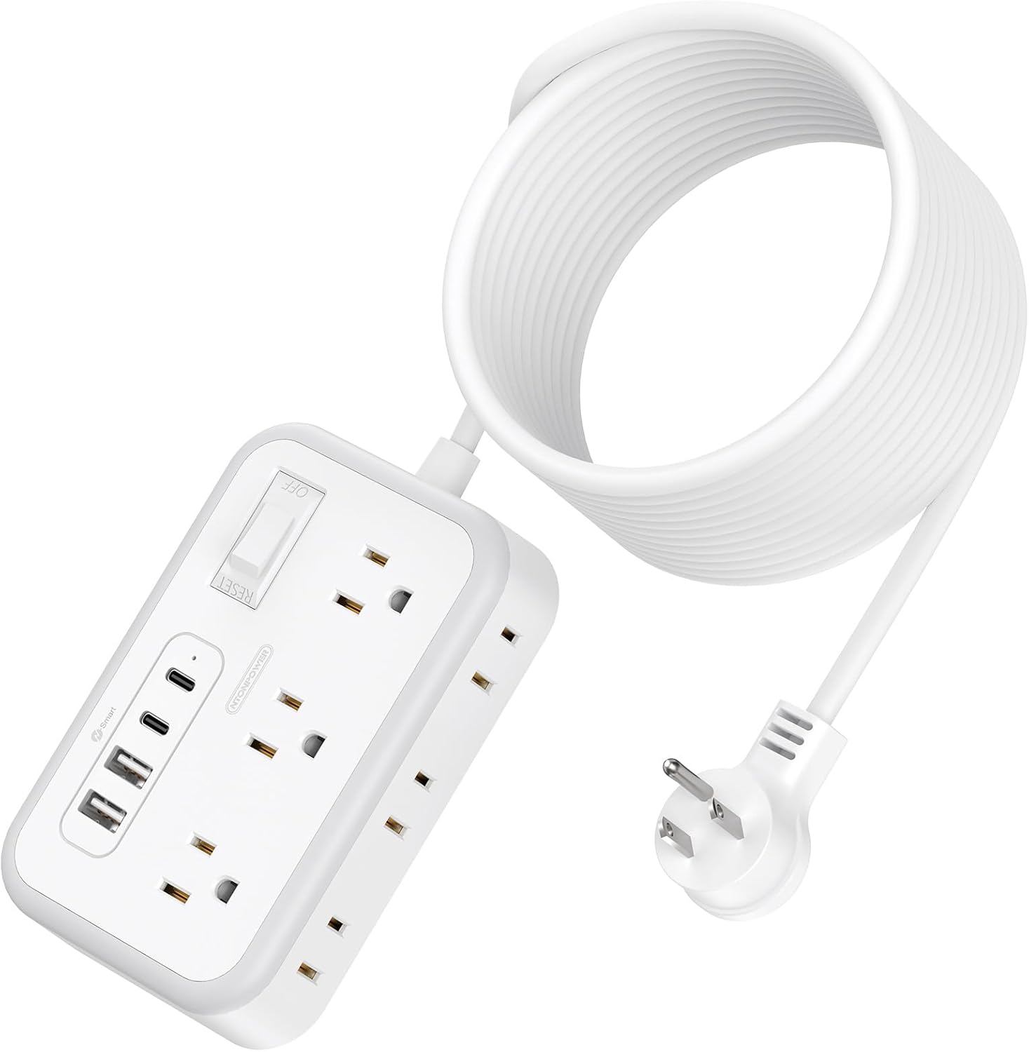 - 【10-IN-1 Power Strip Surge Protector with USB】The extra long extension cord power strip with 6 outlets 4 USB ports(Total 5V/3.1A) can power up to 10 devices simultaneously. With built in Smart IC technology, the multi plug extension cord with usb ports can auto detect and deliver appropriate current to your devices phone, ipad, tablet, kindle, lamp, WITHOUT a variety of converters. This long cord power strip supports a range of 100-240V. Ideal for Home Office Nightstand Desktop & More.