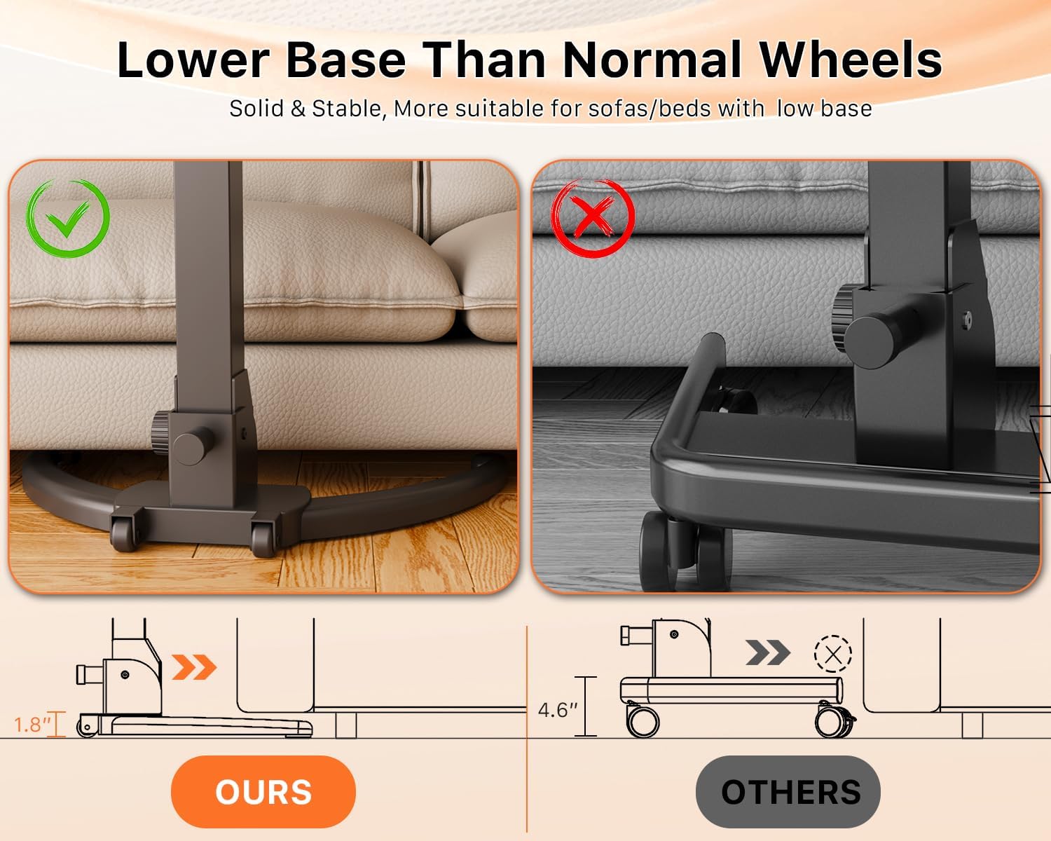 - Recessed Wheels: Designed for lower sofa or bed, the base of the mobile laptop desk can be inserted into a gap as low as 1.9". The solid base adds extra stability to this foldable desk. Round table sides better protect you from bumps