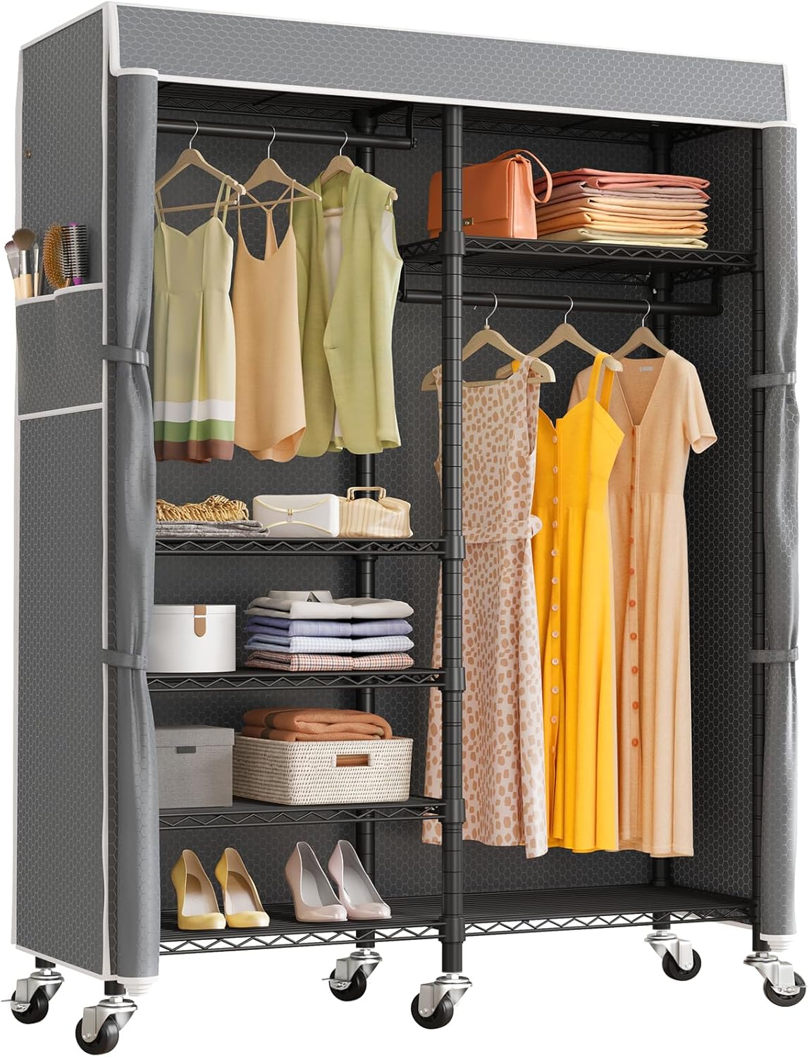 VIPEK R4C Rolling Garment Rack 6 Tiers Adjustable Heavy Duty Wire Shelving Portable Clothes Rack with Lockable Wheels, Black Metal Clothing Rack with Grey Upgraded Polyester Cover, Max Load 620lbs