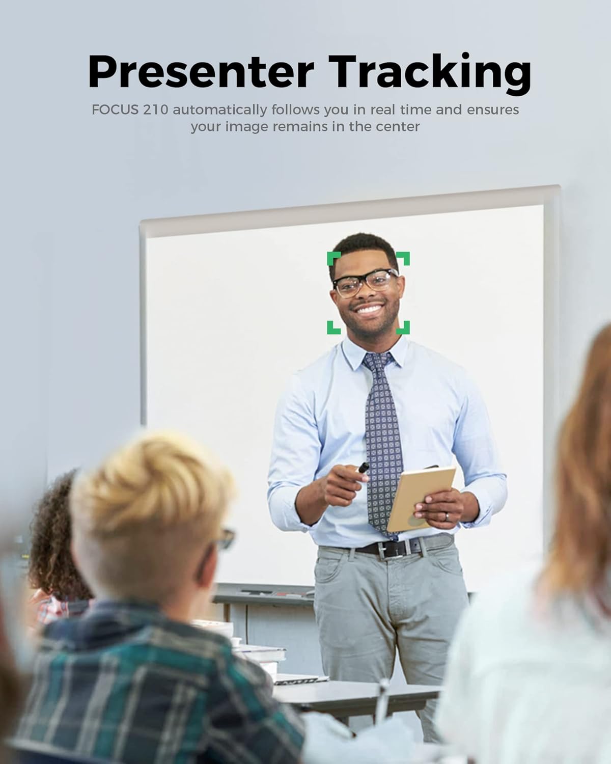 - AI Framing & Tracking: With auto framing, the webcam detects attendees within its FoV and centers everyone into the frame automatically. With presenter tracking, it intelligently detects and follows the presenter that is moving around. FOCUS 210 brings you an immersive conference experience!