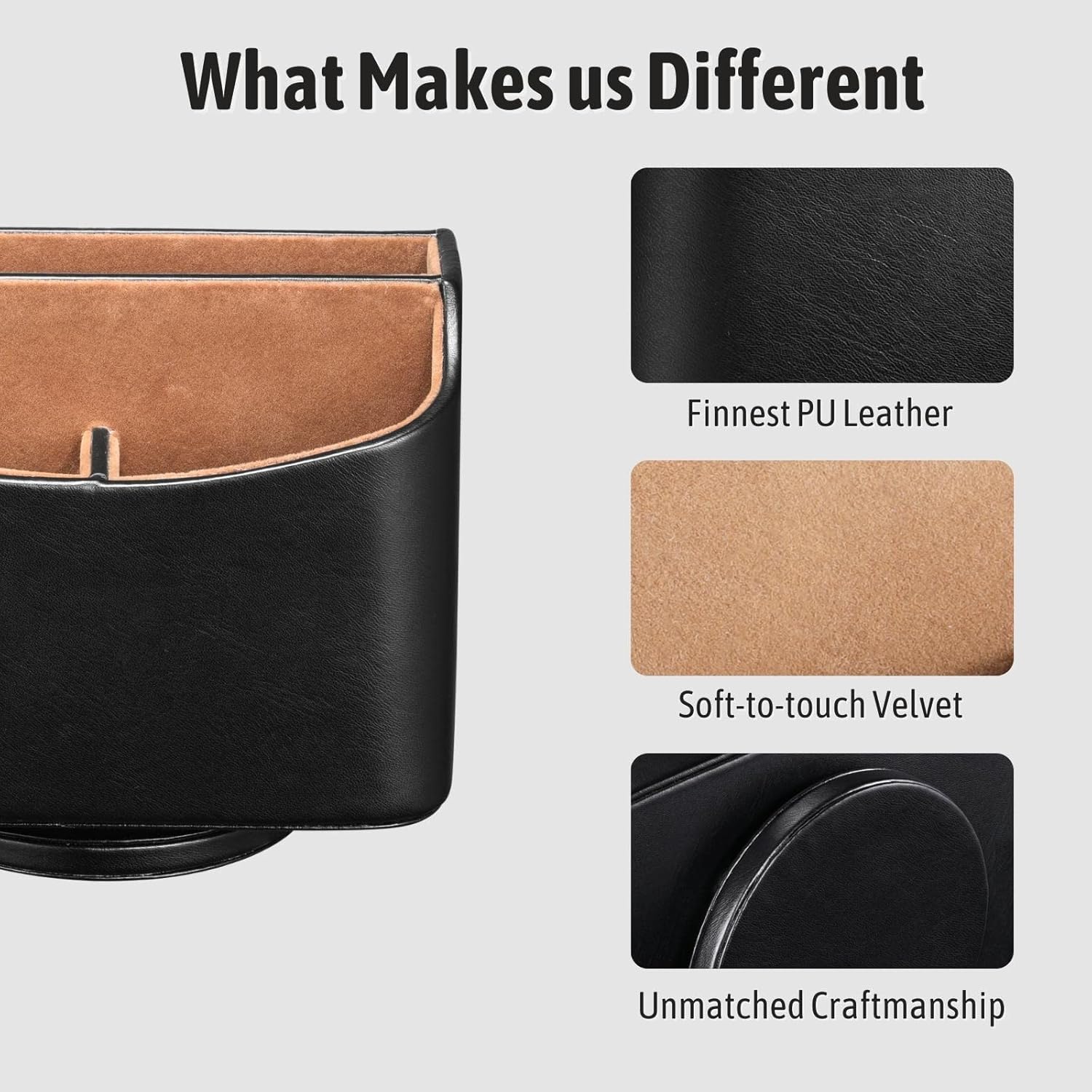 - Crafted with Top Quality Materials: The remote caddy comes with a wooden structure coated with finest PU leather and soft-to-touch velvet interior, giving it a sleek look combined with luxury. ALSO touches and feels great.