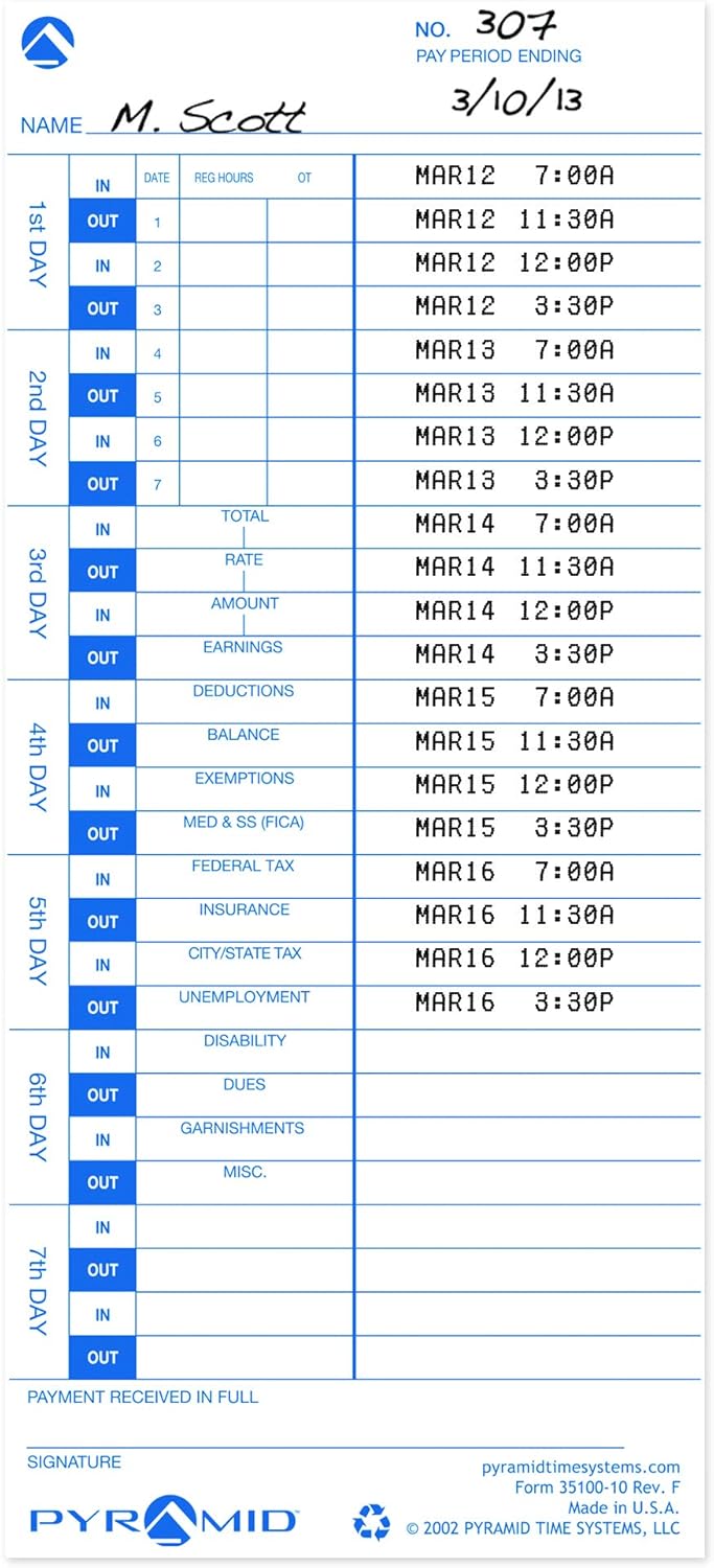 - Data Management: These Authentic Pyramid single-sided time sheets record two in/out Punches each day. Employees can easily log their time for different shifts and schedules, which include a detailed breakdown of compensation and pay deductions.