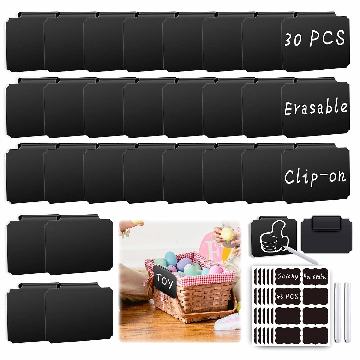 81-Piece Set of Basket Labels Clip On For Storage Bins: 30 Erasable Plastic Kitchen Pantry Labels, 48 Removable PVC Tag Stickers, 3 White Chalk Markers, For Organization Container, Jar, Shelf, Laundry
