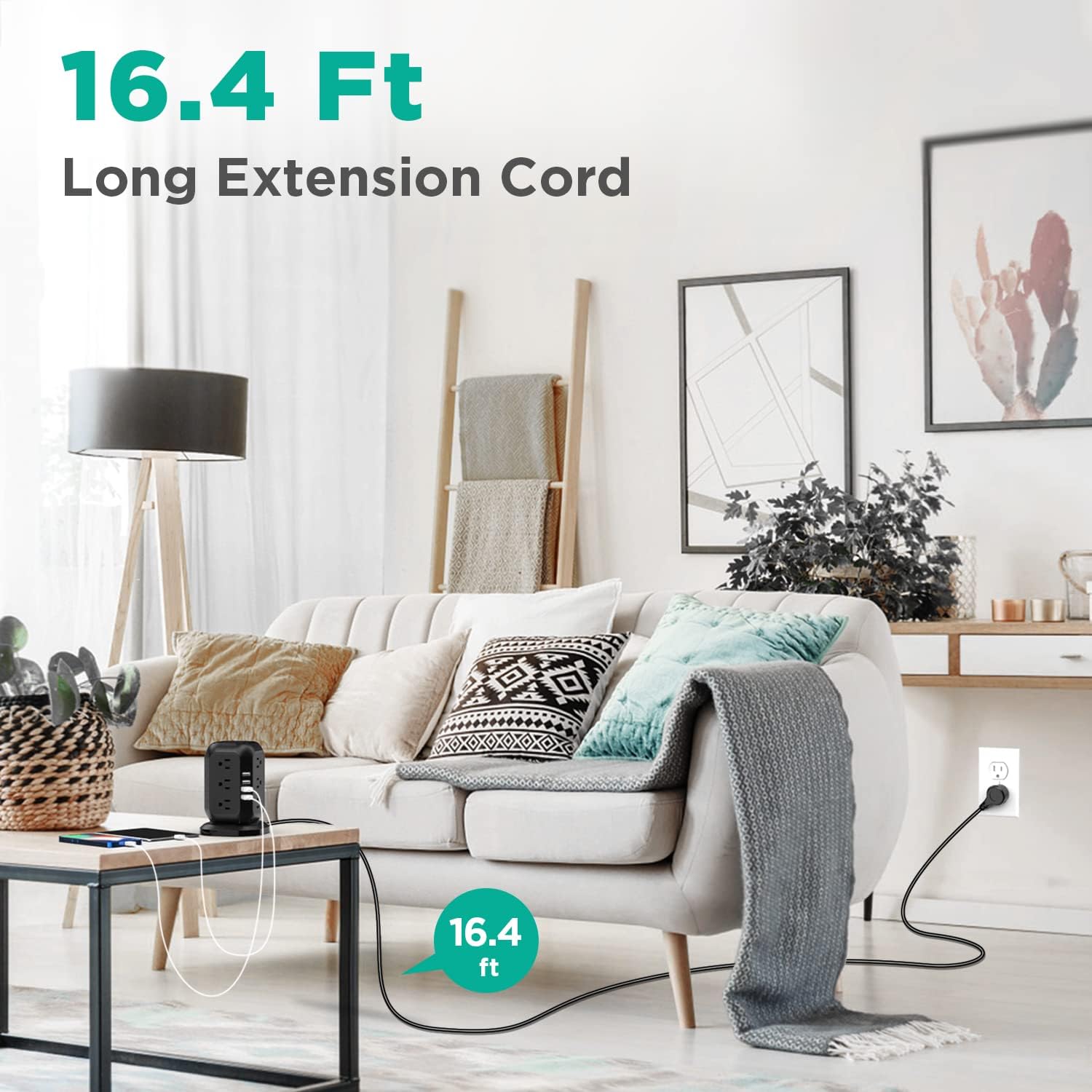 - 16.4 FT Extension Cord with Stable Construction: The power surge protector extension cord 10 FT can be easily placed in any place. The power strip with usb ports is very solidly constructed, which inspires confidence in the safety of the unit. The vertical design of this power strip tower is much better than a traditional horizontal strip for the relatively large power supplies you needed to plug in