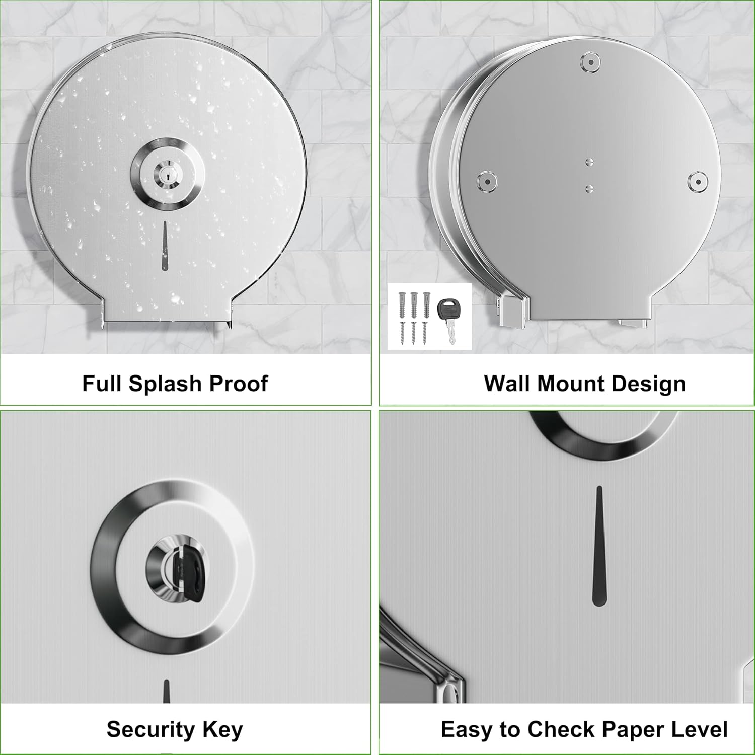 - 【Toilet Paper Dispenser】This stainless steel commercial paper towel dispenser is made of 304 Brushed stainless steel material is rustproof, waterproof, durable, making it ideal for high-traffic areas.