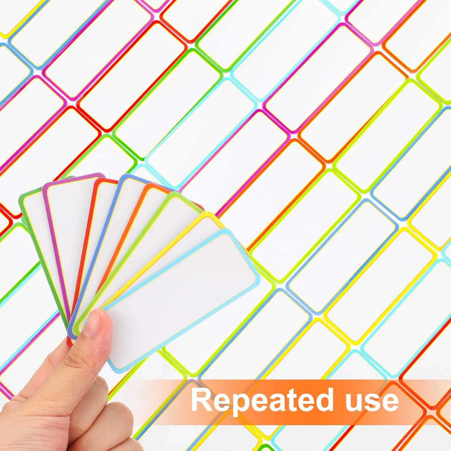 - Quality Material: made of PET dry erase film, write words on it and wipe off easily, can be written repeatedly, no wear in use and easy to clean, 8 different colors, each color has 5 pieces; Size: 3.2 x 1.2 inches/ 8 x 3 cm