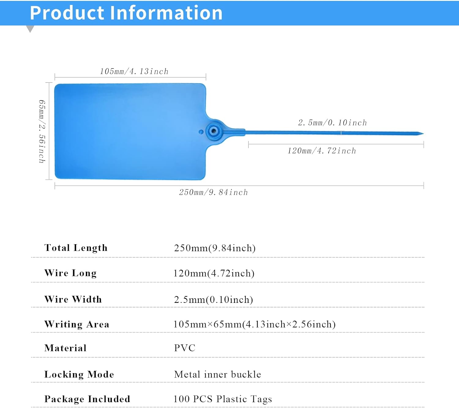 - 1. Specification: Plastic Label Tag Size: 105*65 mm/4.13"*2.56", available locking length: 148mm/5.83", Material: High Density Polypropylene.