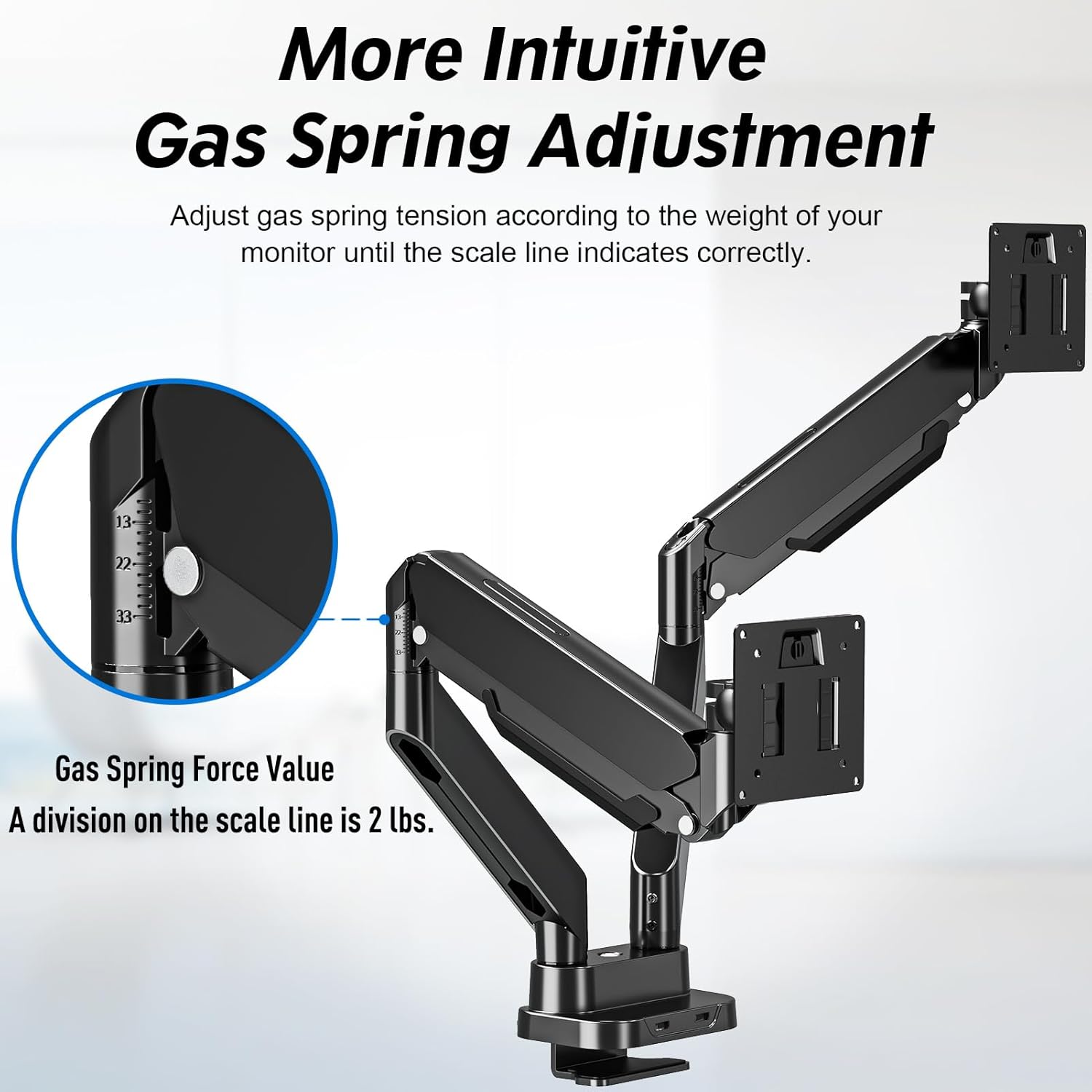 - Stylish and functional - The modern design is sleek and lightweight. Thanks to a streamlined cable routing under the arm, annoying cables remain outside the work area. In space-constrained areas, the monitor mount can be folded back to save space. When you adjust the tension, you can read the gas spring force from in the arm joint. Upgraded designed, monitor stand has a USB-A connector in the base (can be detachable), and comes with a USB 3.0 cable, which is great for charging devices.