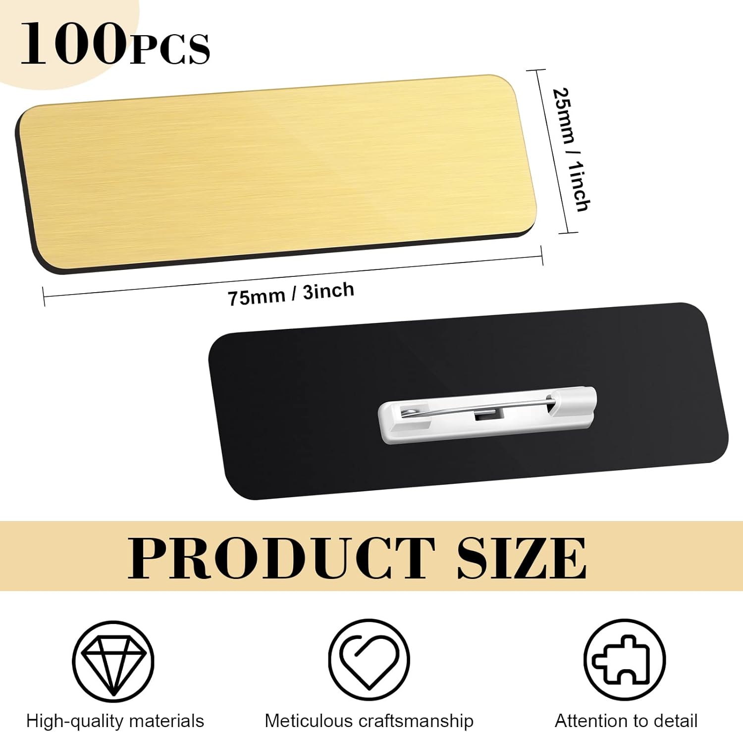 Breling 100 Pieces Name Tags with Pins 1 x 3 Inches Blank Name Tags Reusable ID Badge Holders with Clip for Office Workers Students Employee Custom(Gold)