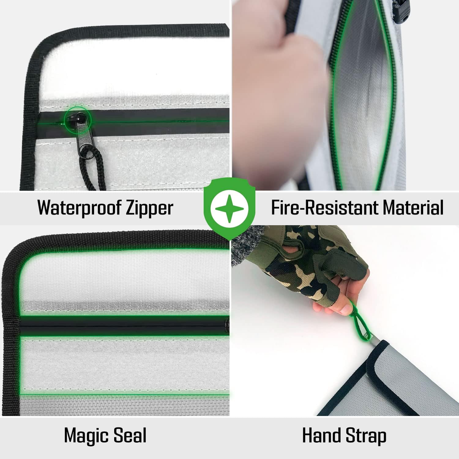 - đ„ăFIREPROOF AND WATERPROOFăFireproof bag can withstand temperatures of 2000â in certain times.Waterproof zippers and magic stickers closure provide great water protection to the fireproof document safe bag.The waterproof fireproof bag provides 100% security seal and maximum protection for your documents and valuables.