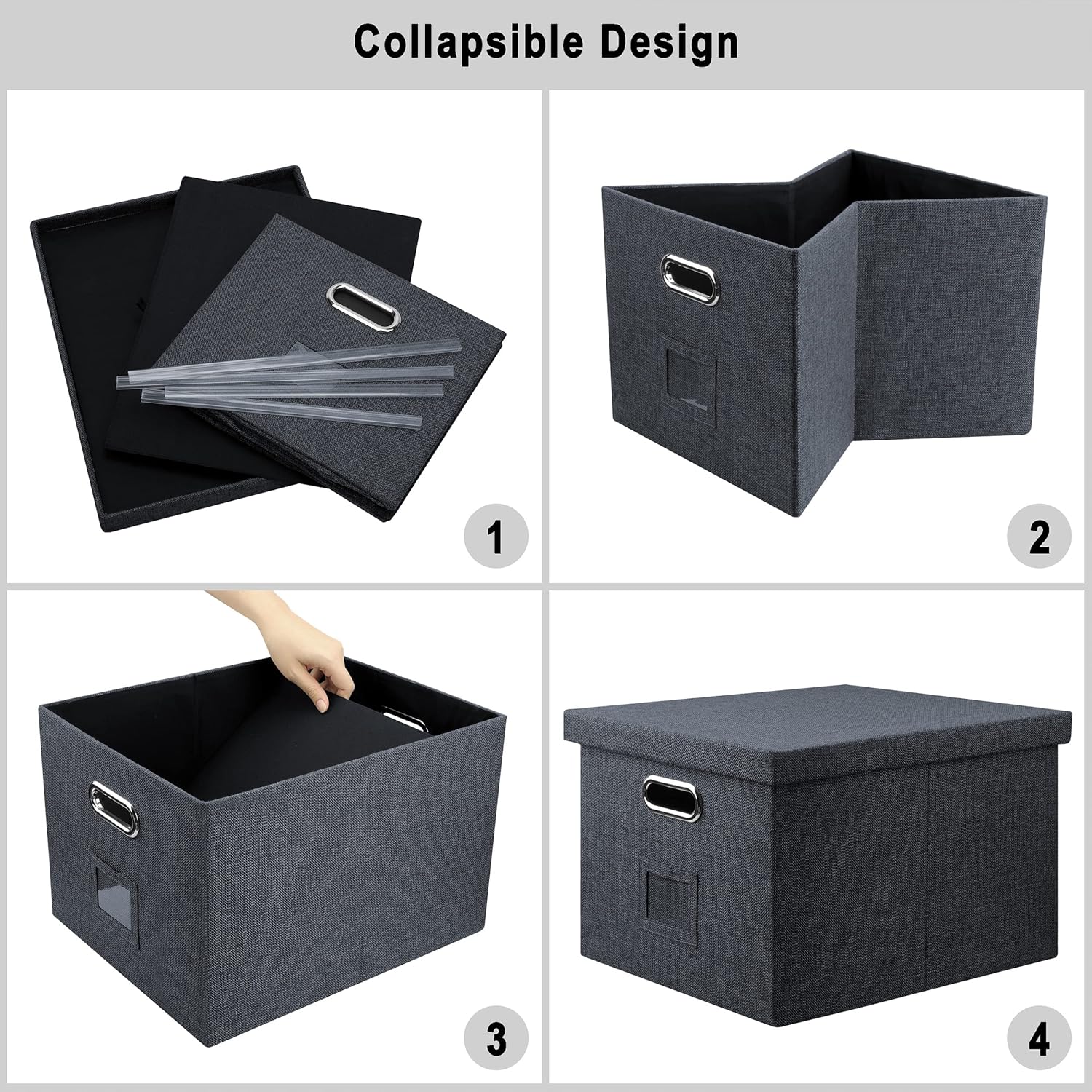 File Organizer, Collapsible Storage Filling Box with Lid for Letter Legal Size Hanging Folders Decorative Linen File Folder Box Document Storage Filing Bin, Dark Gray 2 Pack