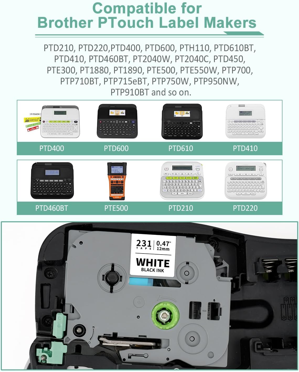 - Compatible for Brother PTouch 12mm Label Makers: PT-D202, PT-D210, PT-D220, PT-D200, PT-D201, PT-D215e, PT-D410, PT-D610BT, PT-D400, PT-D400AD, PT-D400VP, PT-D450, PT-D600, PT-D600VP, PT-D800W, PT-E100, PT-E105, PT-E110, PT-E300, PT-E500, PT-E550W, PT-E800W, PT-H100, PT-H103W, PT-H105, PT-H110, PT-H111, PT-H300, PT-H300LI, PT-H500, PT-H500LI, PT-P300BT, PT-P700, PT-P710BT, PT-P715eBT, PT-P750W, PT-P900, PT-P900W, PT-P910BT, PT-P950NW, PT-200, PT-300, PT-300B, PT-2730