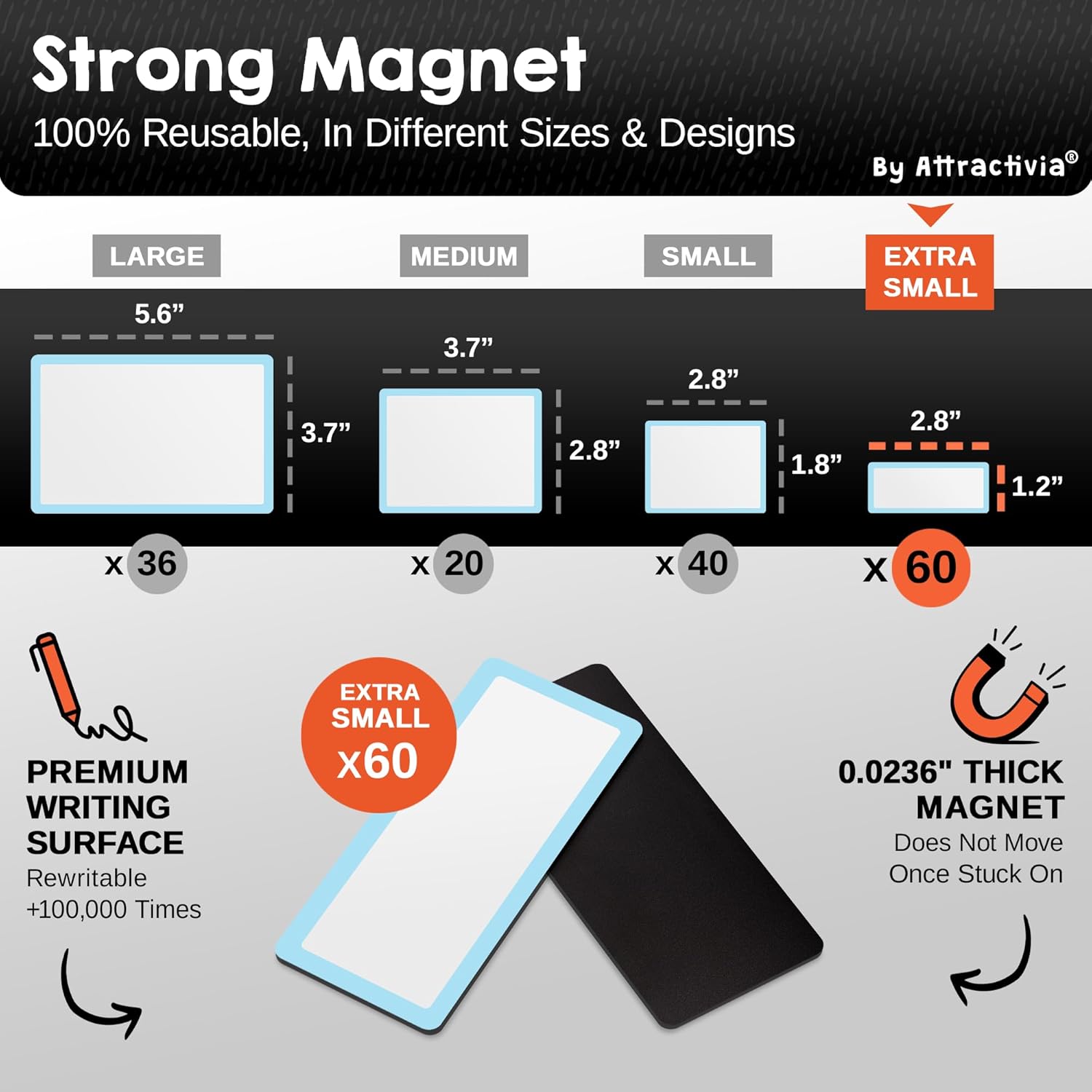 - Instant Organization: Our set of 60 dry erase magnetic labels is perfect for creating writable noticeboards or labeling items at home, in the office, or in a store. These dry erase magnetic labels for dry erase board are also ideal for sorting, identifying, organizing with ease, as magnetic name tags reusable, dry erase magnetic name plates and dry erase stickers.