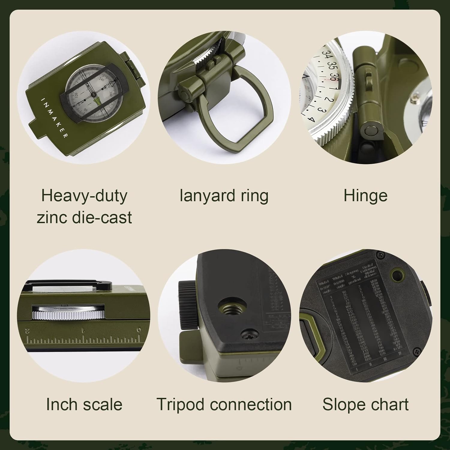 - Small Size, Wide Functions - The INMAKER compass possess a sighting line, magnifier viewer, tripod attachment, reading eyepiece, slope ratio chart and adjustable prism. Definitely portable , compact enough to be fastened on your belt or rucksack without compromising your actions.