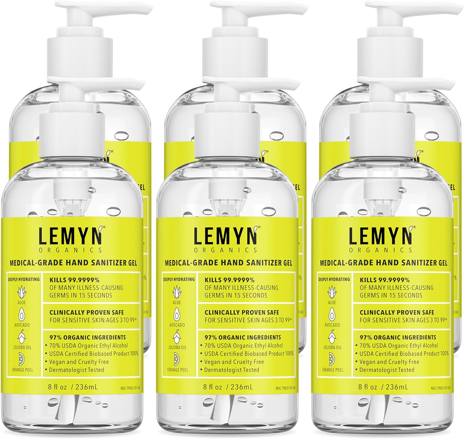 Medical Grade Hand Sanitizer Gel - 97% ORGANIC - 8 FL.OZ. with PUMP (PACK OF 6)