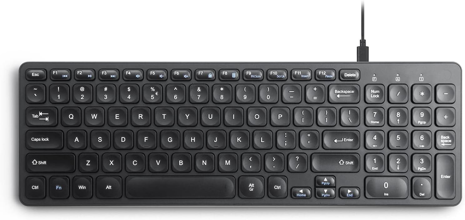 - Compact and Ultra-Slim: Compact keyboard design with integrated number pad; dimensions: 485 x 236 x 50 mm (19.09 x 9.29 x 1.97 inches)