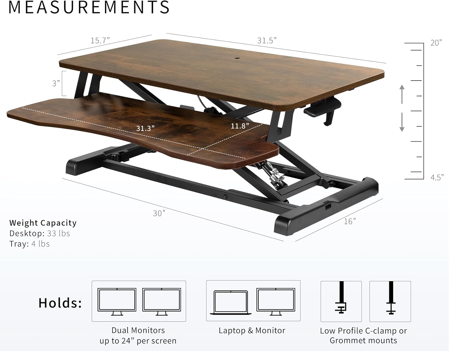 - Space Efficient 31.5" Surface: The top measures 31.5” x 15.7”, which maximizes space while still providing room for dual monitors. The 31.3" x 11.8" (10.5" in center) keyboard tray raises in sync with the top surface to create a comfortable workstation