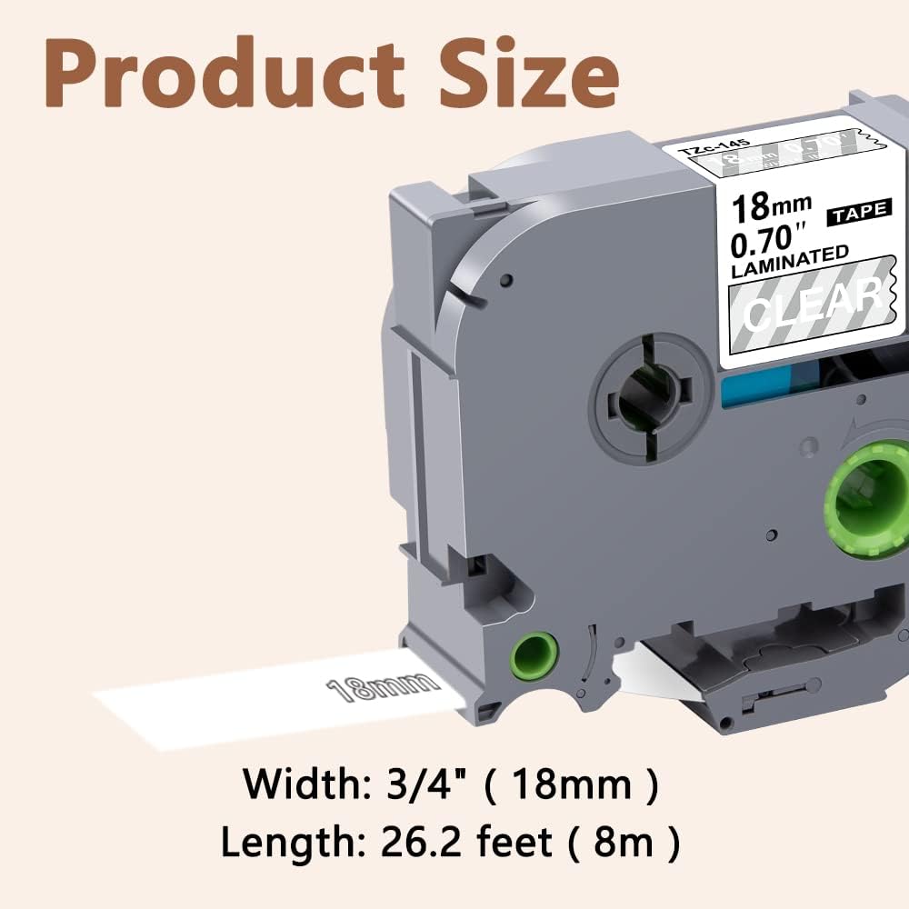 - Size - 3/4" ( 18mm ) x 26.2' ( 8m ) each 18mm label tape. Color - White letter on clear tape