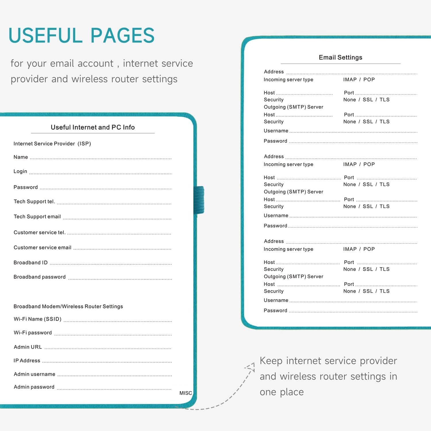 - All-In-One Password Book & More - This password organizer has space to store all the information you may need when you surf the web, including software license information, email settings, wireless router settings, and notes section.