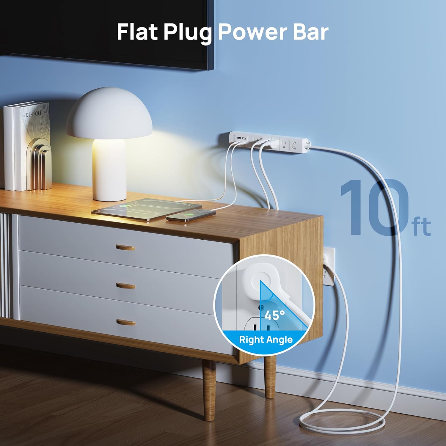 - Special Feature : 10ft long extension cord power strip surge protector, 4 outlets with 3 USB & 1 Type C charging port, 45-degree ultra flat plug 10ft long extension cord power strip surge protector, 4 outlets with 3 USB & 1 Type C charging port, 45-degree ultra flat plug