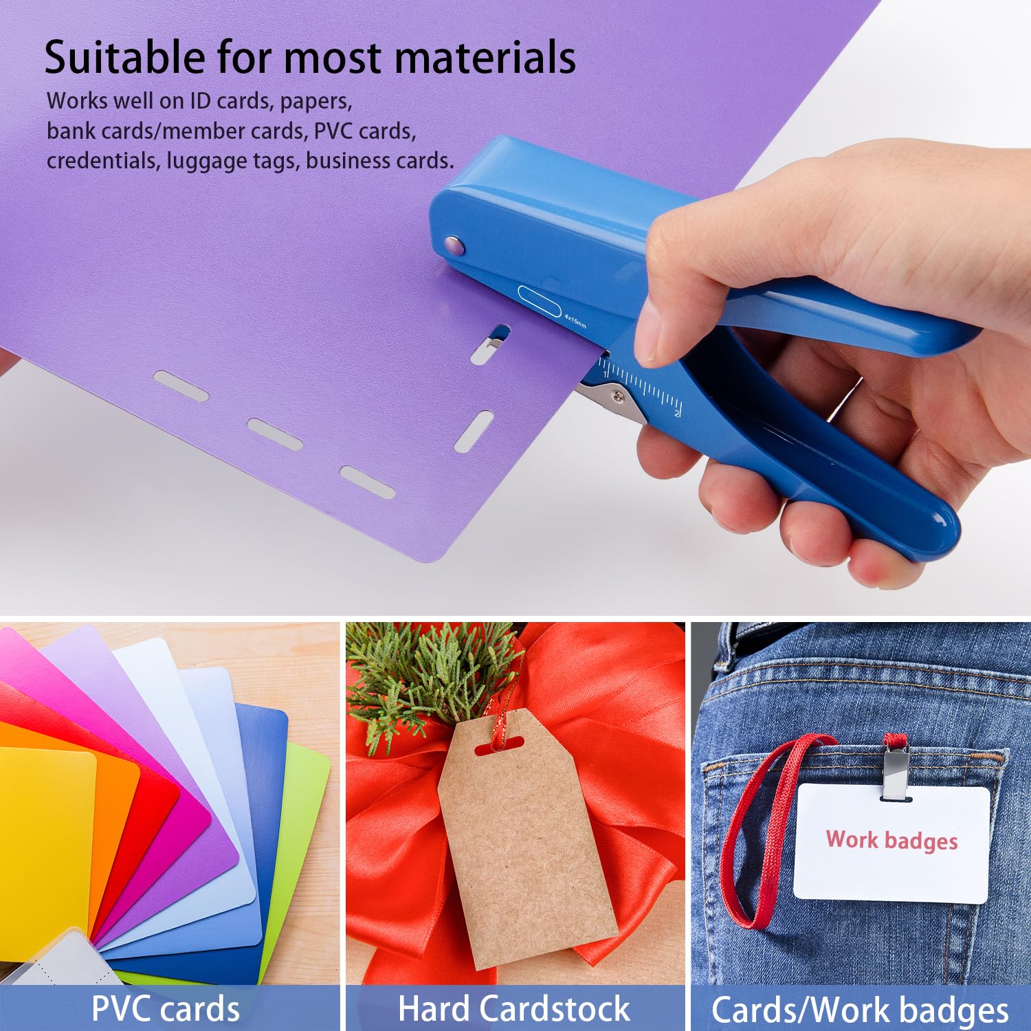 - Versatile & Durable Design--Works flawlessly with ID Cards (<1mm),Bank Card(<1mm),PVC (<1mm),Luggage Tags and Hard Cardstock.➤IMPORTANT NOTE➤Avoid punching thin paper,fabric,or adhesive tape to prevent tool jamming.If jams occur from prohibited materials,contact us anytime for a free replacement guarantee.