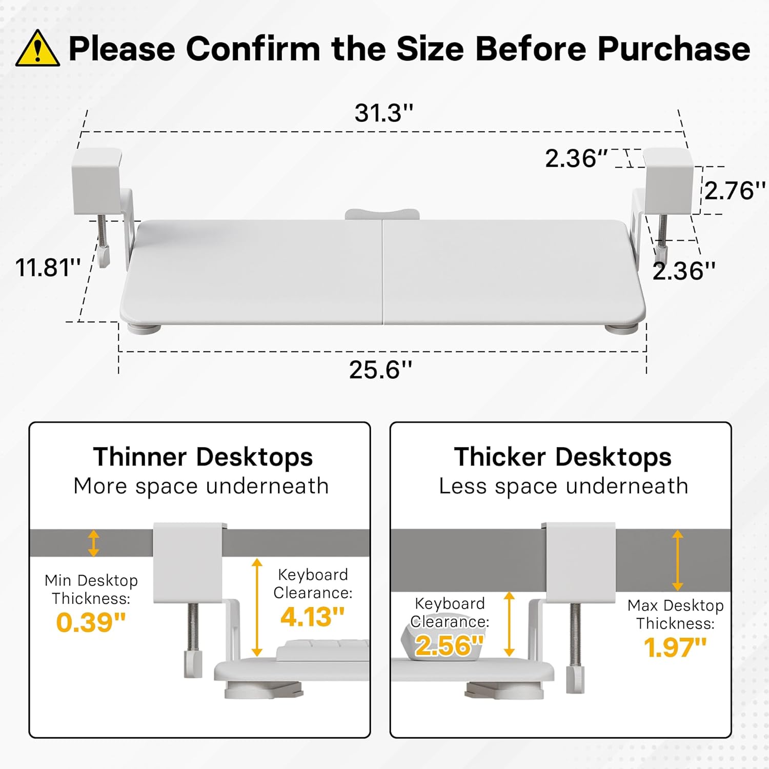 - ✅ MEASURE YOUR DESK BEFORE ORDERING – The tray requires at least 31.3" of width and 11.4" of depth underneath your desk to slide in and out smoothly. Confirm these dimensions to avoid fitment issues