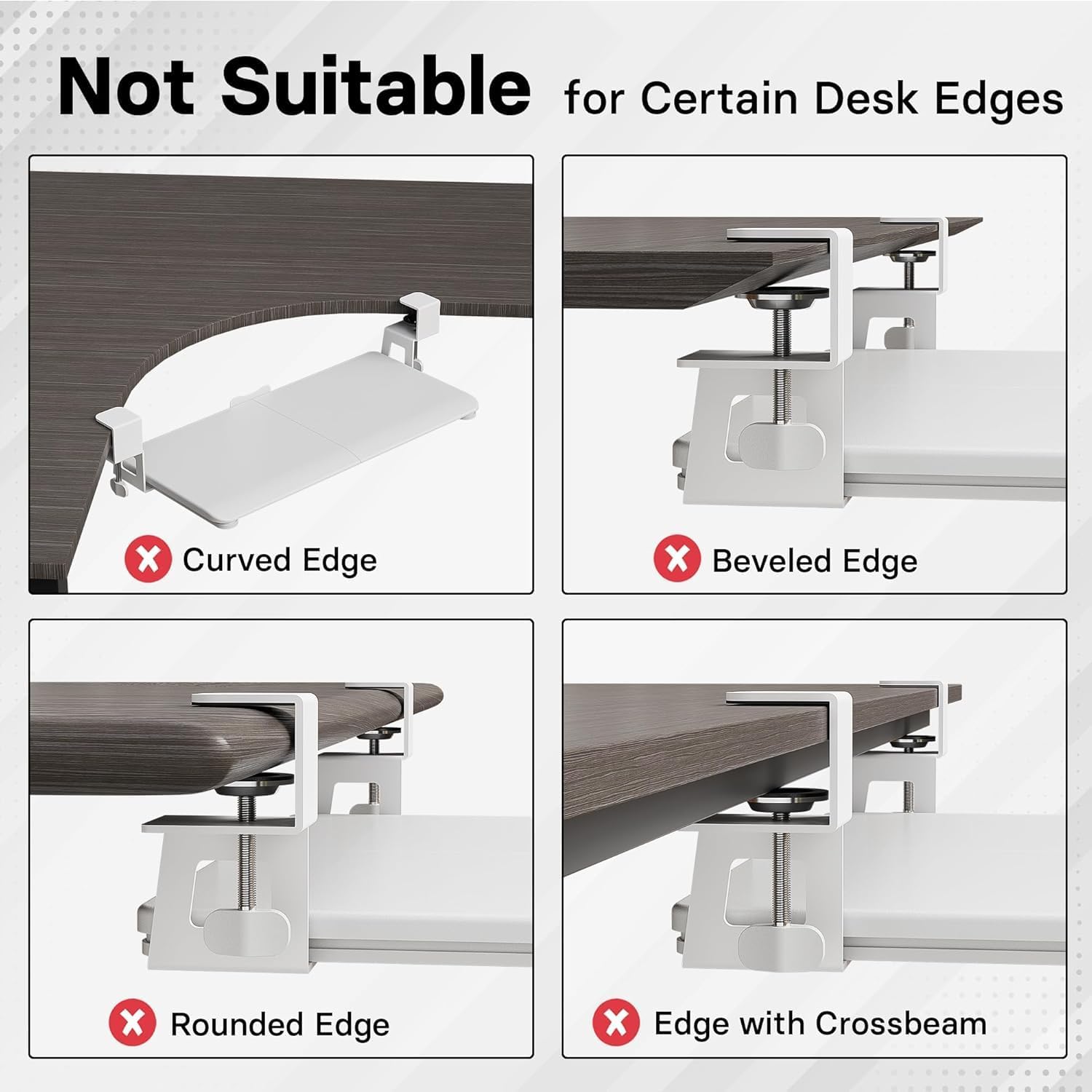 - ❗️ CHECK DESK COMPATIBILITY BEFORE PURCHASE – This under-desk keyboard tray won’t work with desks that have curved, beveled, or rounded edges, or crossbars/support beams underneath. Please check the product images to ensure your desk has a flat, unobstructed underside for clamp installation
