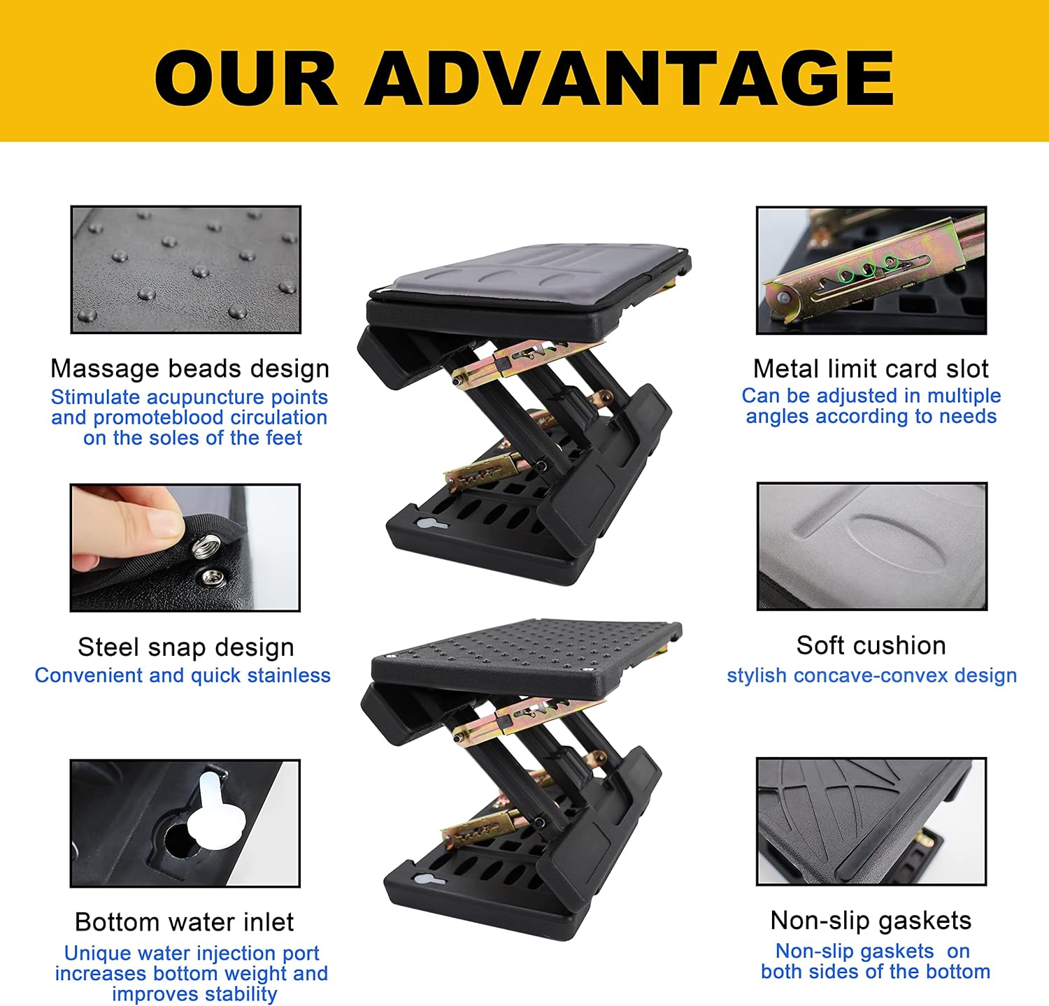 - Product features:Ergonomic Foot Rest Under Desk, no need to install, simple operation, Desk Foot Rest can be ADJUSTED in multiple angles, increase Footrest For Under Desk use experience, massage the textured surface, massage roller,can play the role of Foot Massage