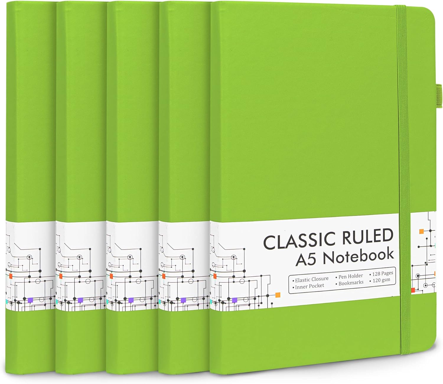 feela 5 Pack Notebooks Journals Bulk, Hardcover Notebook Classic Ruled Lined Journals with Pen Holder for Women Girls School Business Supplies, with 5 Black Pens, 120 GSM, 5.1”x8.3”, A5, Green