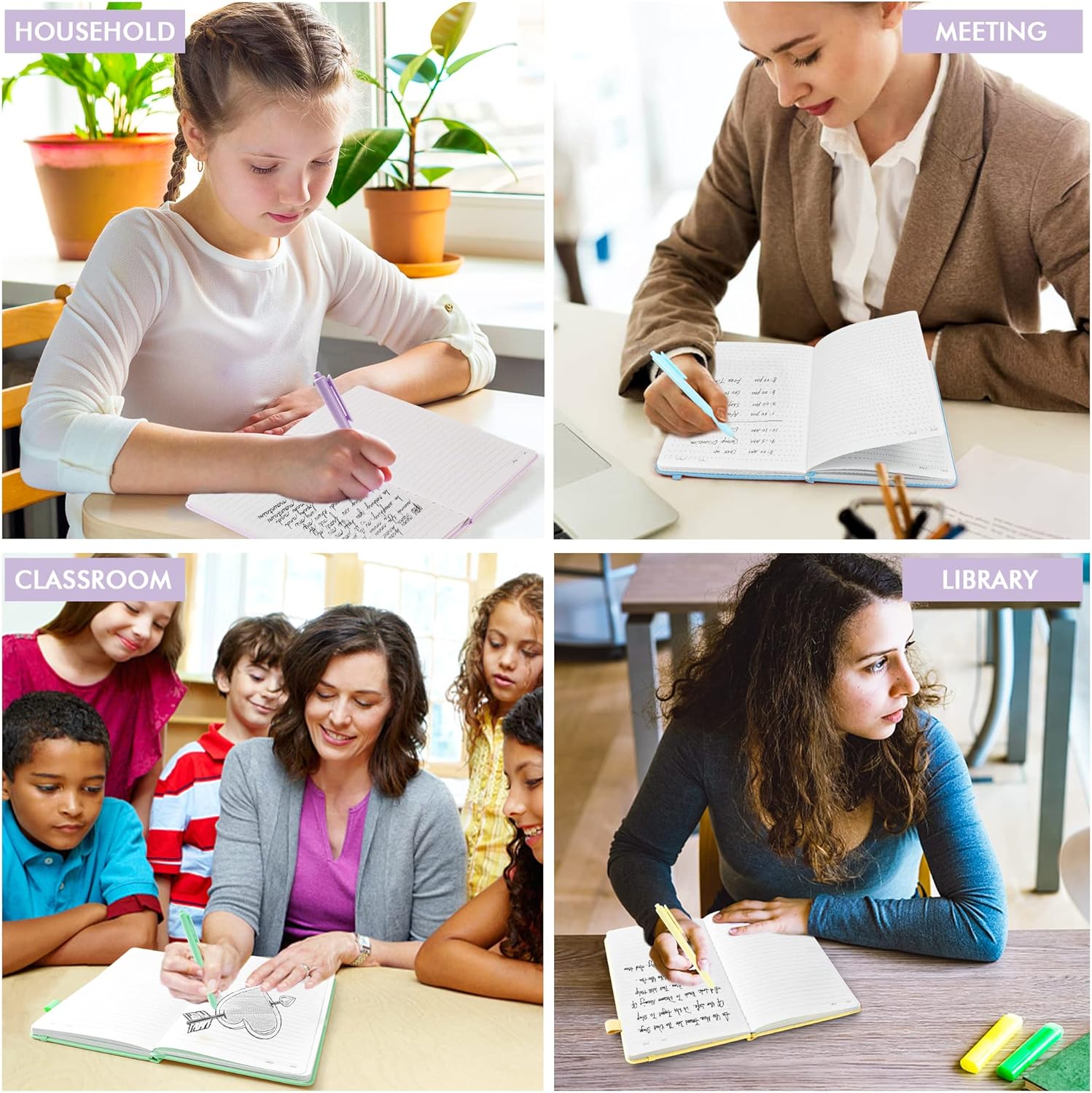 - 5 different pastel colors for these notebooks. There are 5 Black Retractable Pens in the box. You can use it as soon as you receive it. These pens are perfect to be put in the pen holder of the classic ruled notebook. Large tube has the capacity of restoring more ink, which makes them long lasting. Quick drying can avoid smearing and smudge.