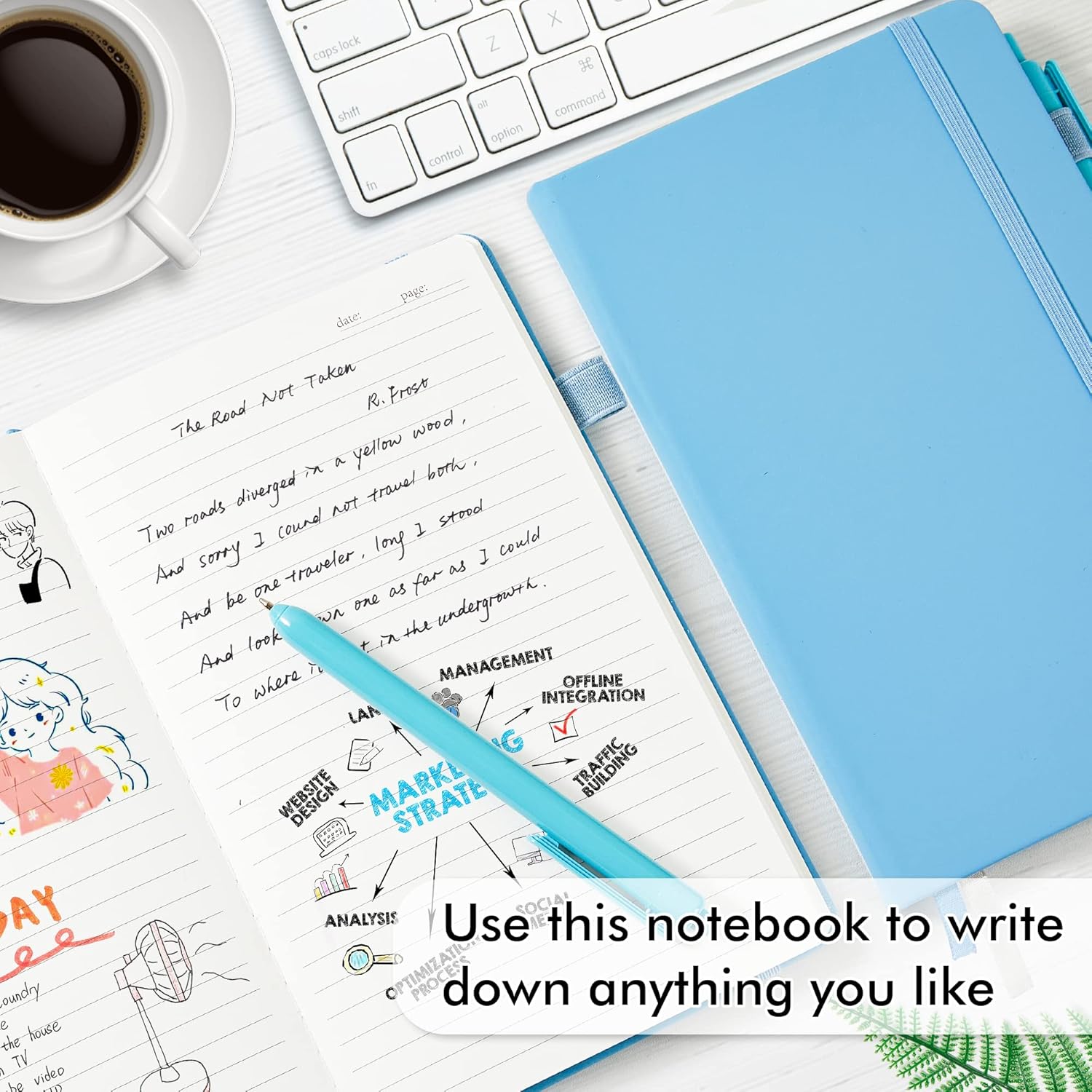 feela 5 Pack Notebooks Journals Bulk, Hardcover Classic Ruled Lined Journals with Pen Holder for Women Girls School Business Supplies, with 5 Black Pens, 120 GSM, 5.1”x8.3”, A5, Blue