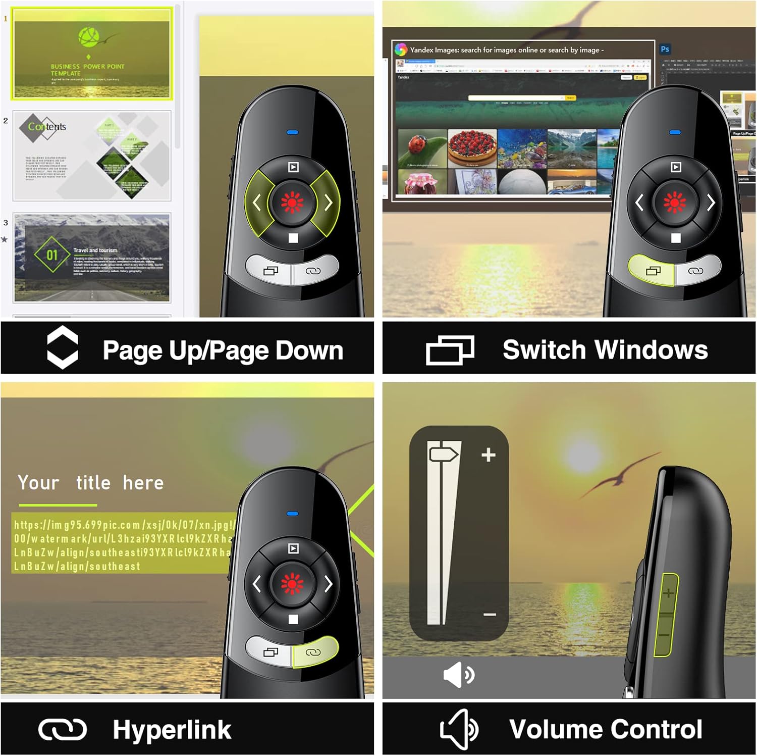 - 【Multi-features PowerPoint remote】Laser Pointer Presentation Remote serves all the basic functions of page up/down, full/black screen, and add extra functions of hyperlink, volume control, switch windows; Buttons’ layout very clear, it makes slides so much easier for presentation