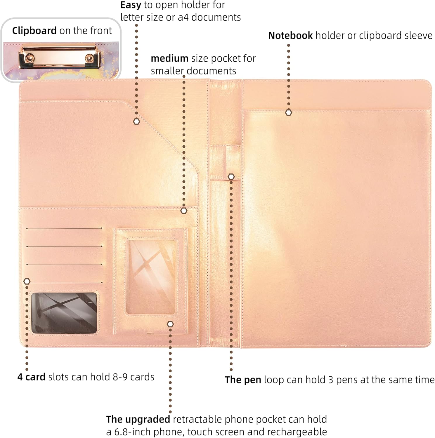 - ✔Powerful and Organized Storage: Our portfolio folder is 360°ー foldable and features a retractable transparent phone pocket (with a charging port) that can accommodate a 6.7-inch phone. The portfolios also have 4 card areas next to it. The right side of the leather portfolios has a large pocket and a matching notebook. The versatile pocket design is perfect for all your daily use and business travel needs.