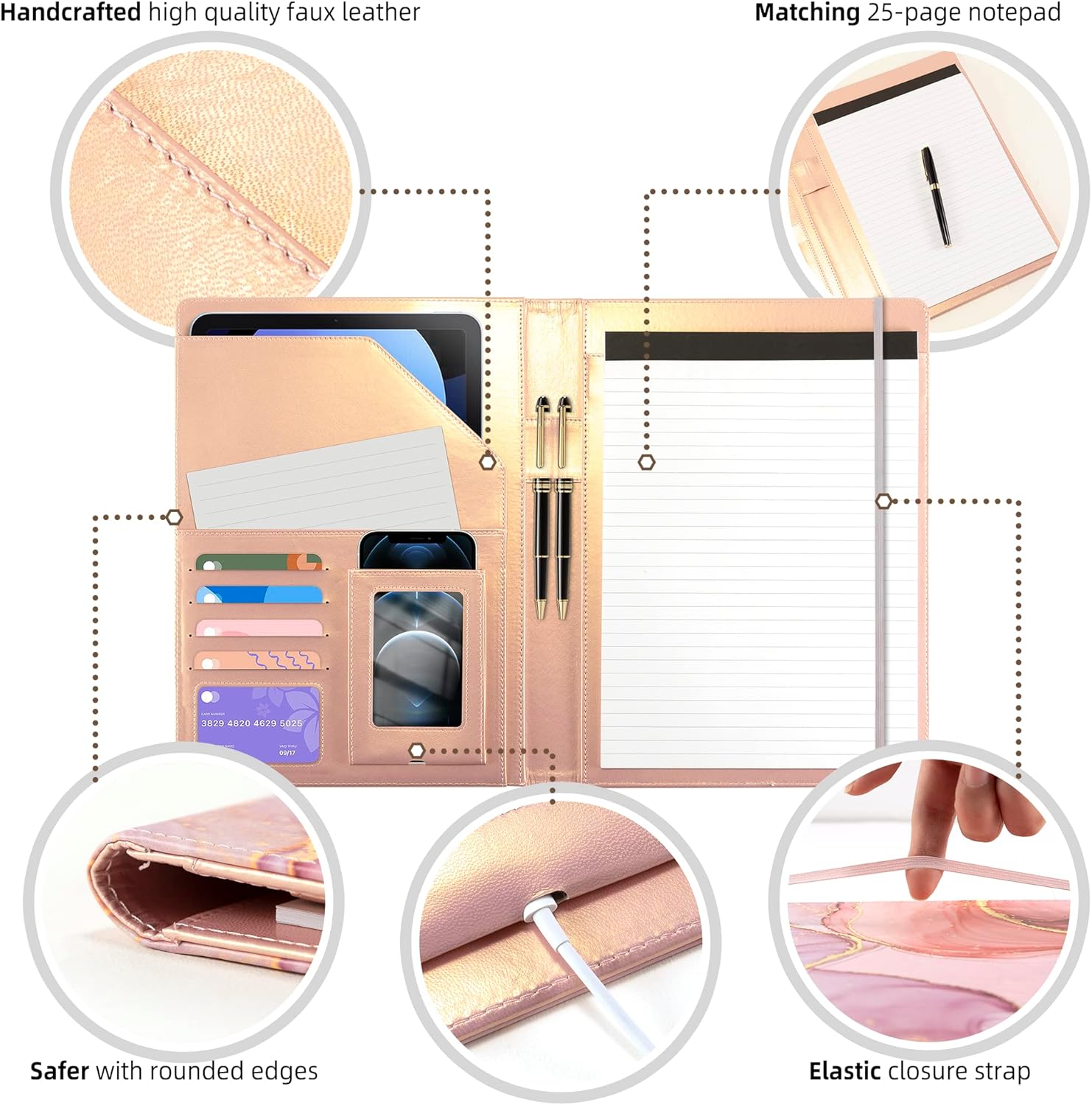 - ✔Fashion meets Functionality: Our leather portfolio folder boasts a sleek clipboard design that allows you to jot down notes or ideas on the go, and hold up to 80-100 sheets.The side straps not only keep it securely closed but also offer convenient storage for loose papers and small items. The rose gold clip adds a touch of elegance, while the removable notepad (11*8.5'') offers ultimate convenience.