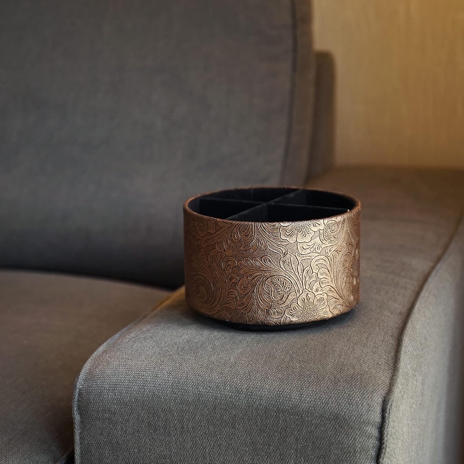 lizimandu Round Leather Art Supply Organizer,Remote Control Holder,360 Degree Spinning,Multi-Functional Pencil Holder,4 Compartments Desktop Stationary Organizer(1-Gold)