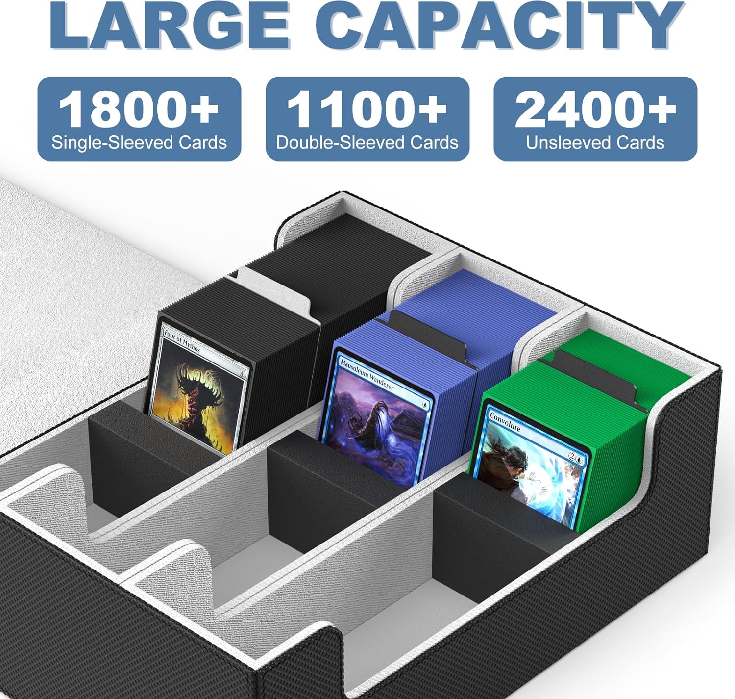 - 【Holds 1800+ Sleeved Cards】The size of our deck card case is 11.5x10x4.2 inches, large enough to easily store 1800+ single-sleeved cards, 1100+ double-sleeved cards, 2400+ unsleeved cards.