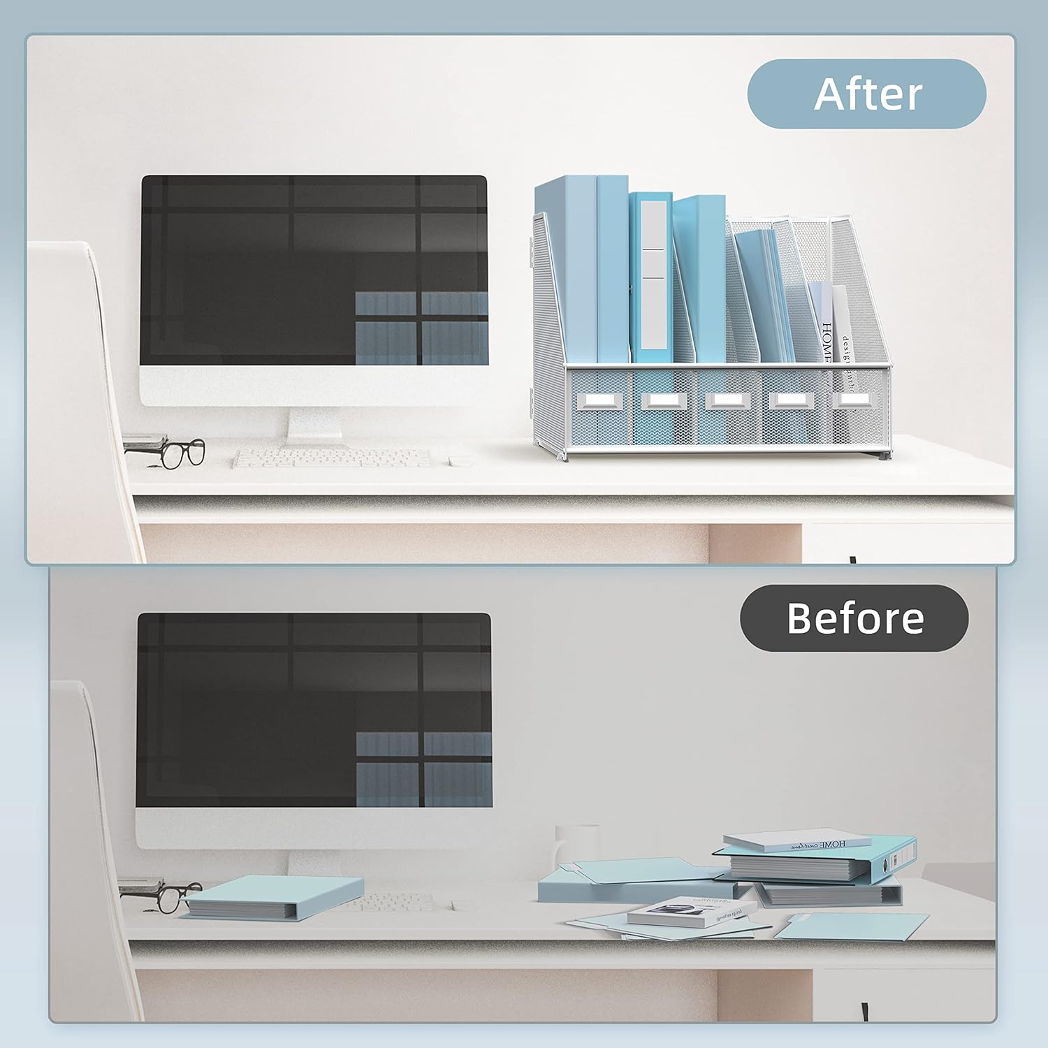 - [Space-Saving] Our mesh magazine file holder features 5 compartments, designed to consolidate your desktop items. This file organizer tames desk clutter, saves valuable space, and maintains a clean and orderly workspace.