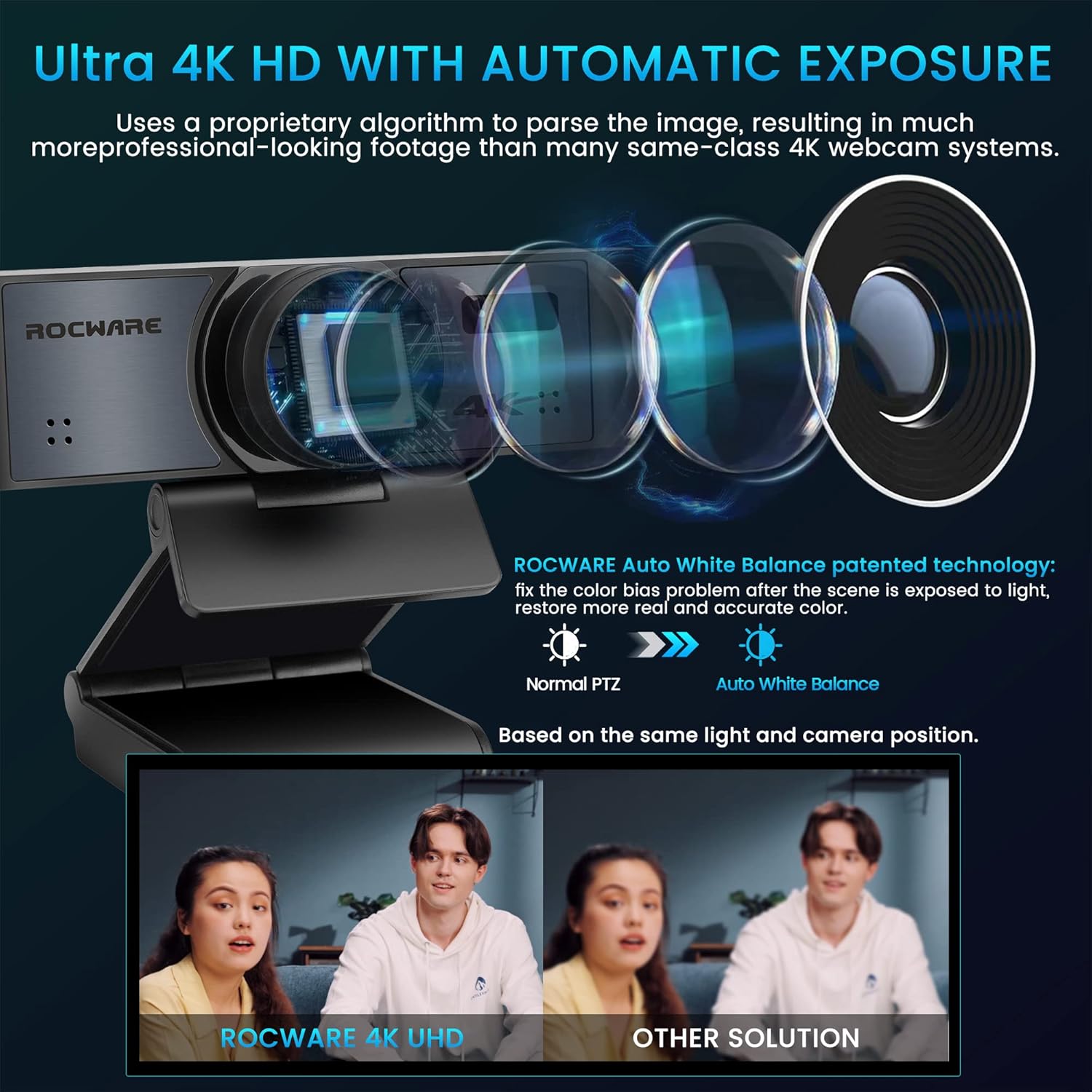 - 【4K Ultra HD & 60fps Streaming Webcam】The Rocware RC16 external webcam with a Real-4K ultra-high-definition lens, new generation 1/2.7-inch UHD CMOS sensor, and an effective pixel count of 8.29M, that can operate in low-light environments which is great for meeting & streaming. This 4K webcam for pc will automatically adjusts the image angle based on the detection area of the field of view, makes you feel as if you're meeting with people face to face