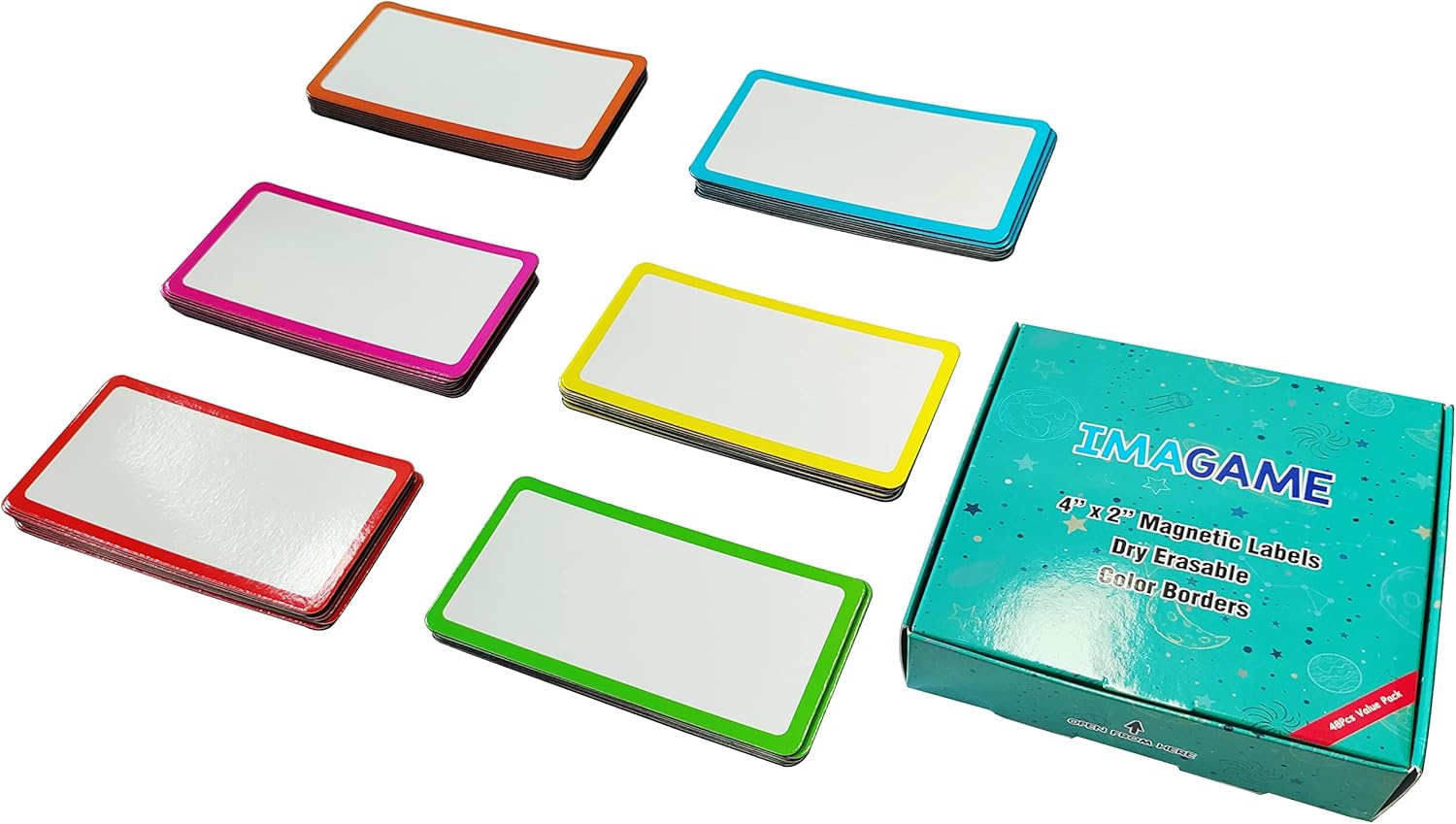 - PACKAGE DETAILS: Each set comes with 48 magnets in the following color borders: Red, Blue, Orange, Yellow, Pink, and Green. Measuring 2 x 4 inches, these dry erase magnetic labels are an essential labeling resource for any household.