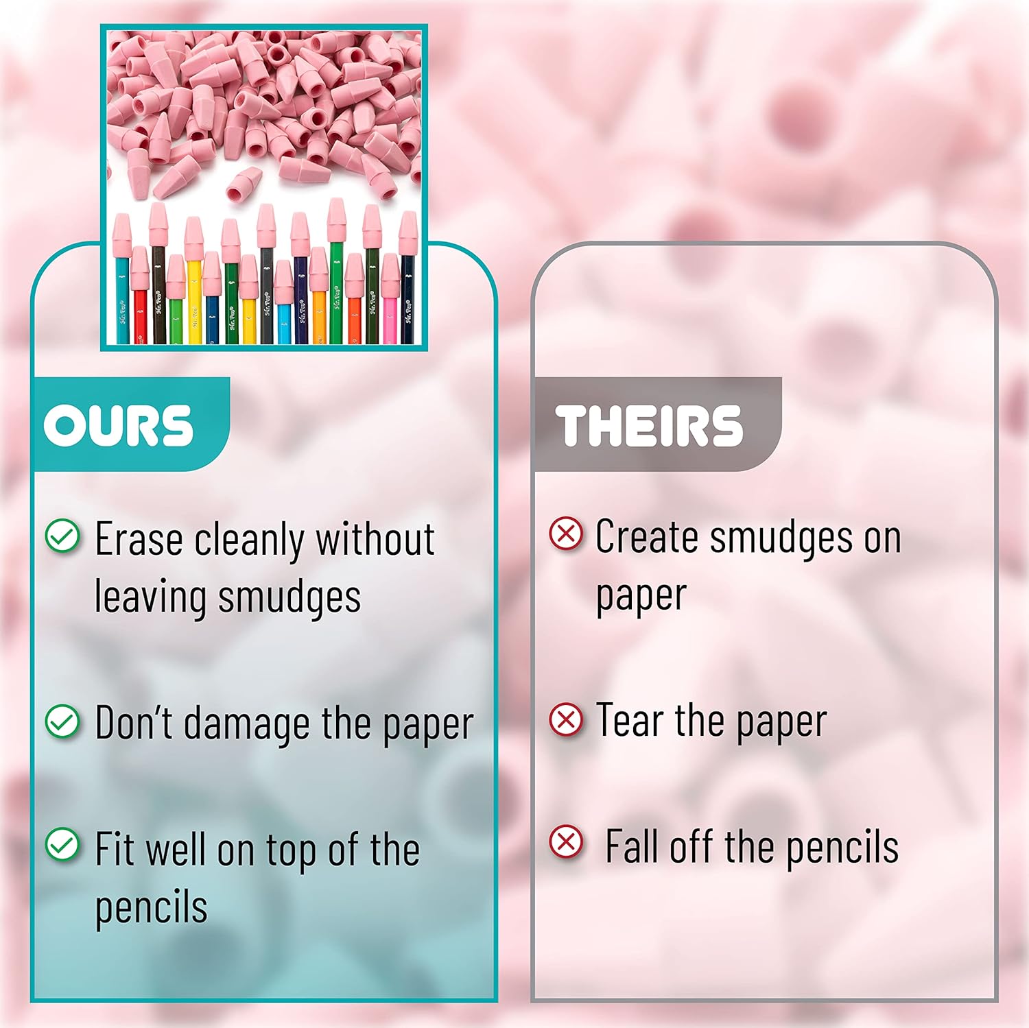 - You can use pencil top erasers on most surfaces without smudging, and they clean easily without scratching, tearing, or damaging paper. Perfect for exams, essays, and everyday writing.