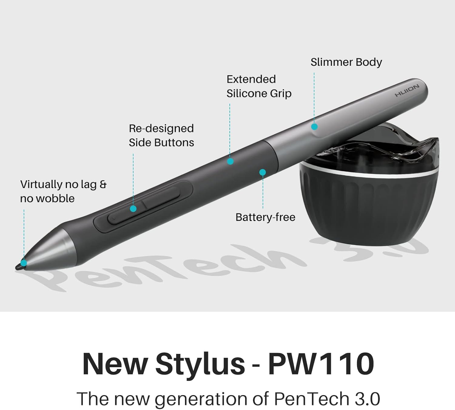 - Ergonomics Pen Design: The new digital stylus PW110 is improved designed with slimmer body, soft silicone grip & accessible side buttons for better ergonomics & comfort.