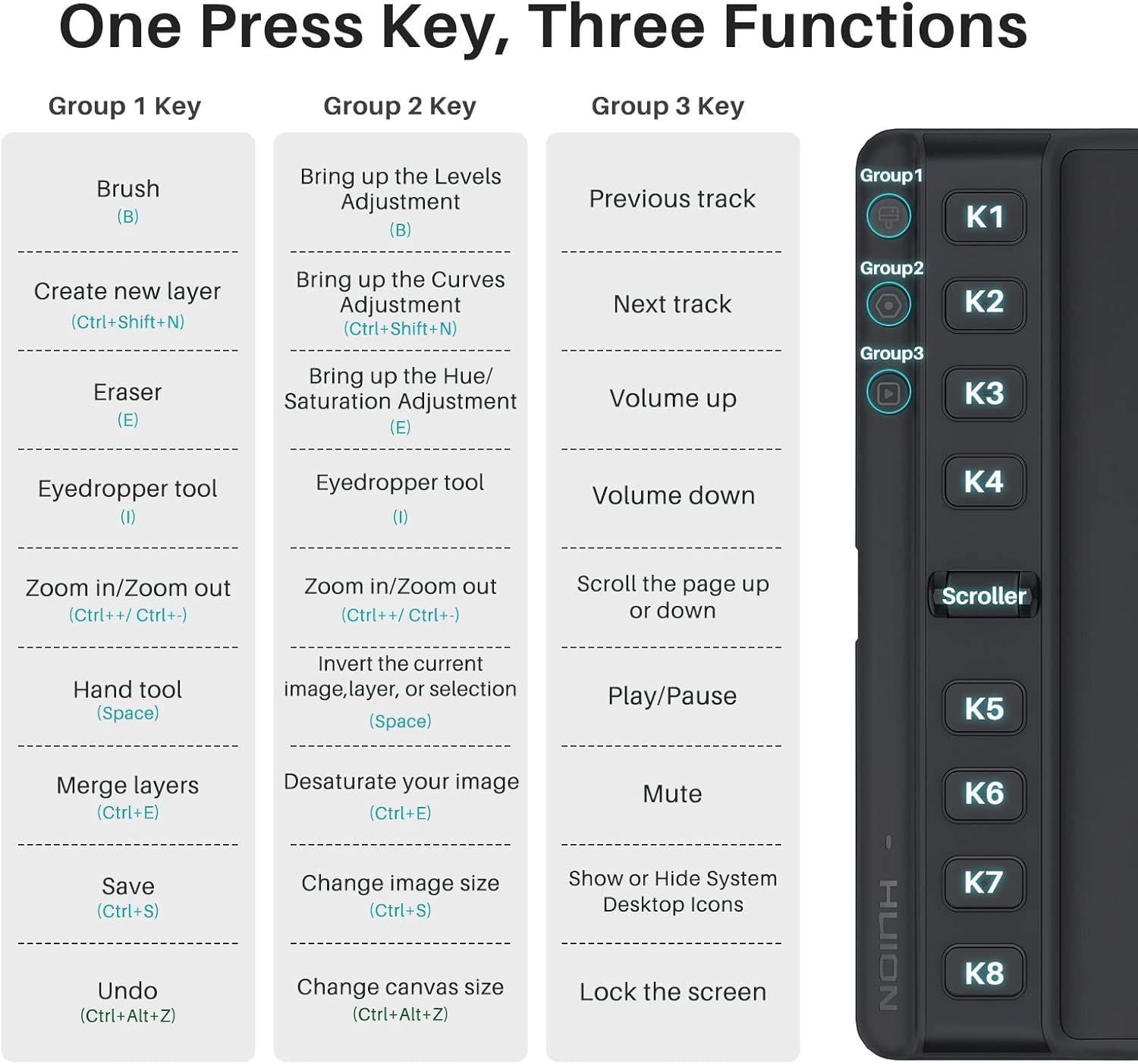 - Programmable Scroll & Shortcut Keys: Unique scroll wheel & 8 press keys can be customized to your favorite shortcut so that your creative work become smoother and more efficient. You also can change the setting for different apps.