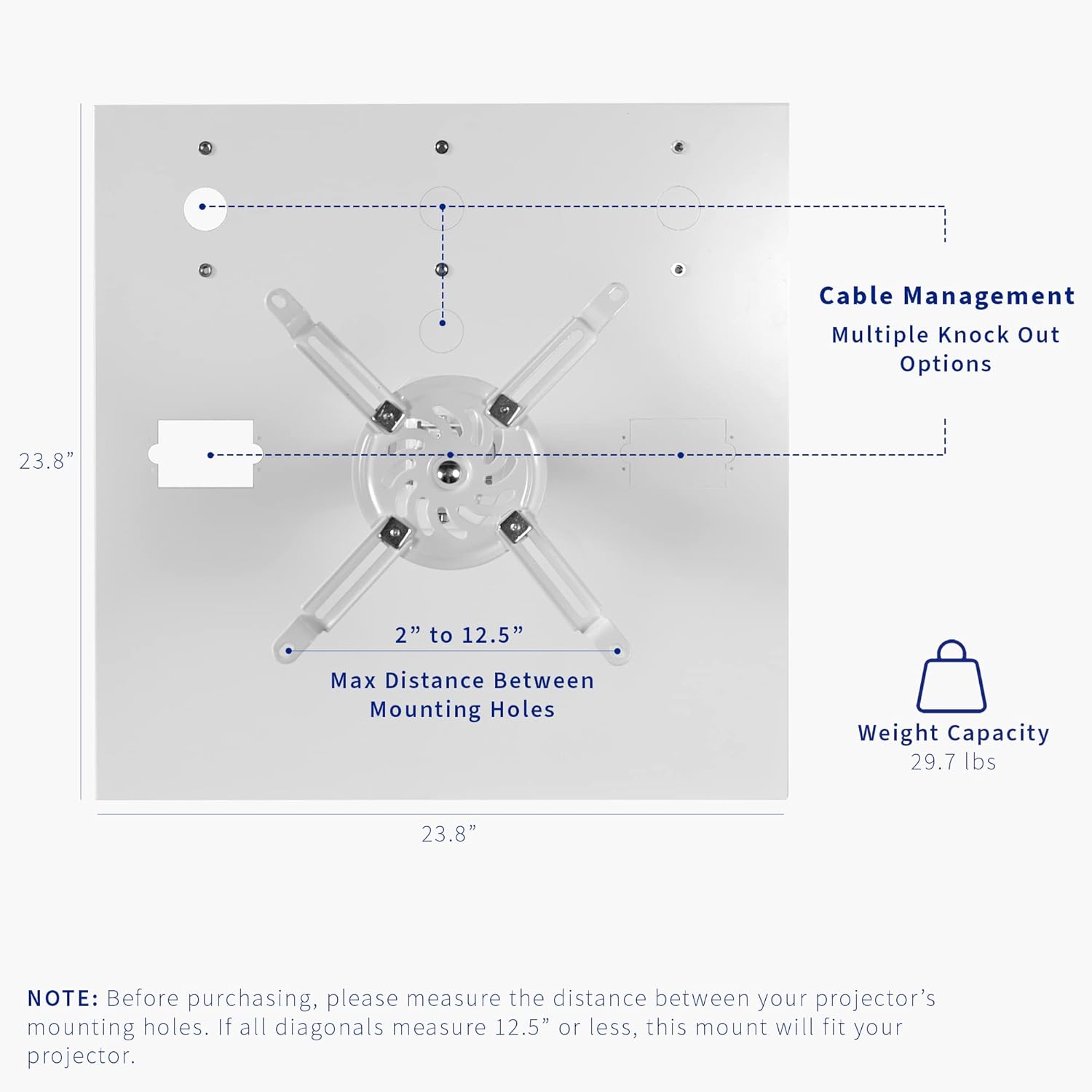 - Universal Design: Adjustable mounting points enable this bracket to fit the majority of projectors on the market with mounting hole diagonals measuring up to 12.5”. If your projector has 3 mounting holes, simply remove one of the arms to fit your display