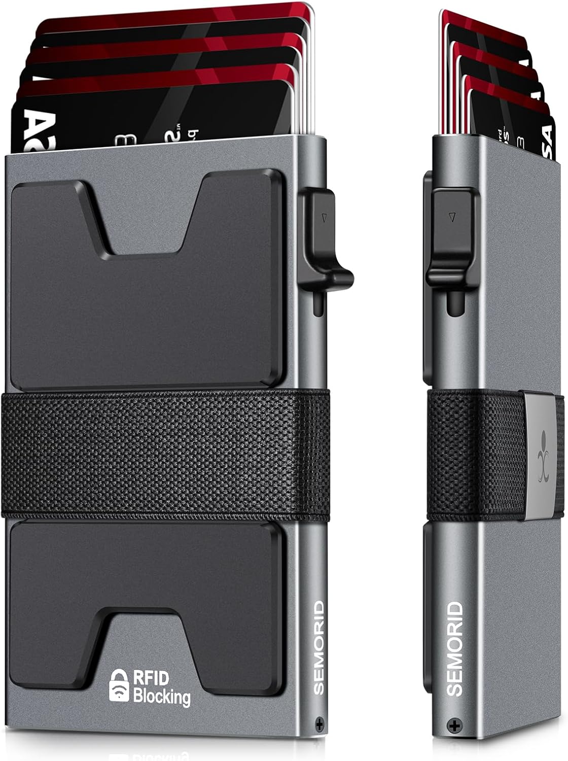 Slim Aluminum Card Holder Wallet for Men, Durable Expandable Backplate, RFID Blocking Minimalist Metal Pop Up Wallet, Holds 12 Cards Plus Cash (Grey)