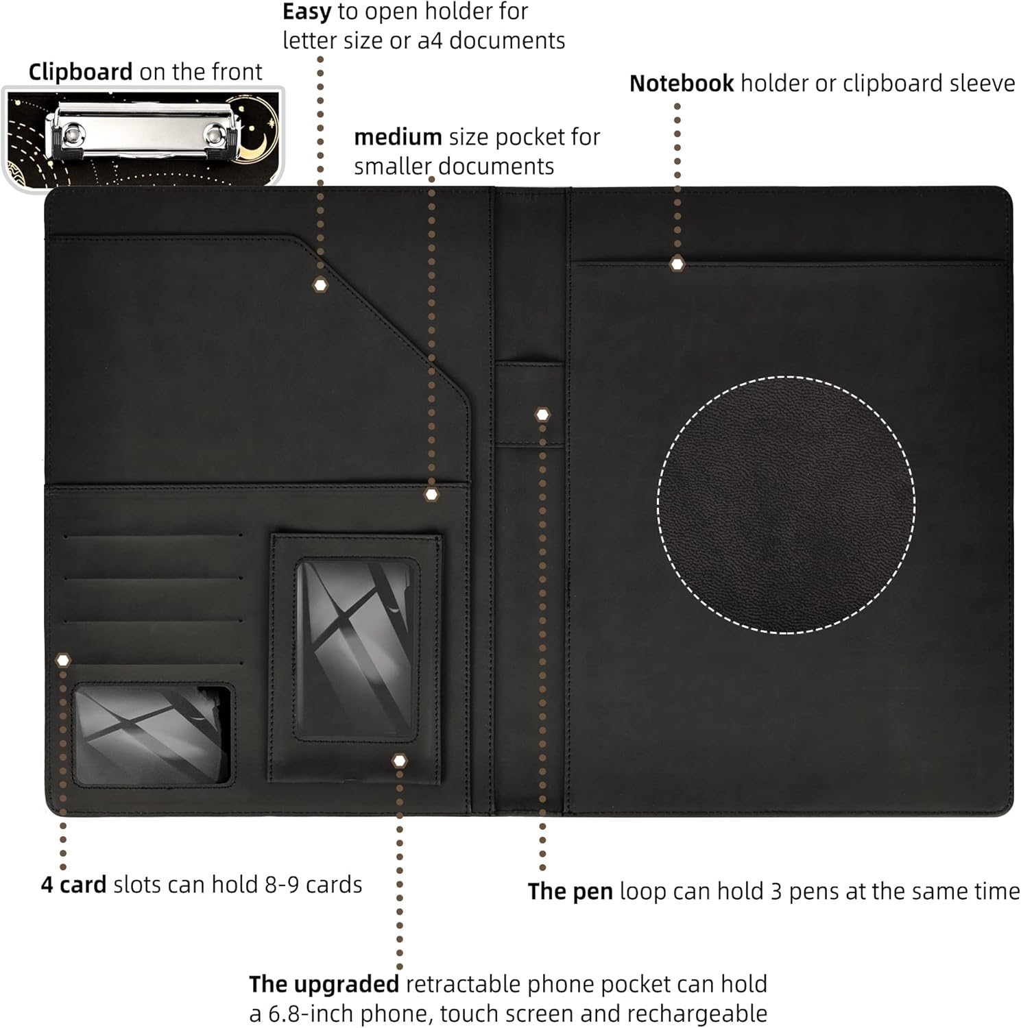- ✔Powerful and Organized Storage: Our portfolio folder is 360°ー foldable and features a retractable transparent phone pocket (with a charging port) that can accommodate a 6.7-inch phone. The portfolios also have 4 card areas next to it. The right side of the leather portfolios has a large pocket and a matching notebook. The versatile pocket design is perfect for all your daily use and business travel needs.