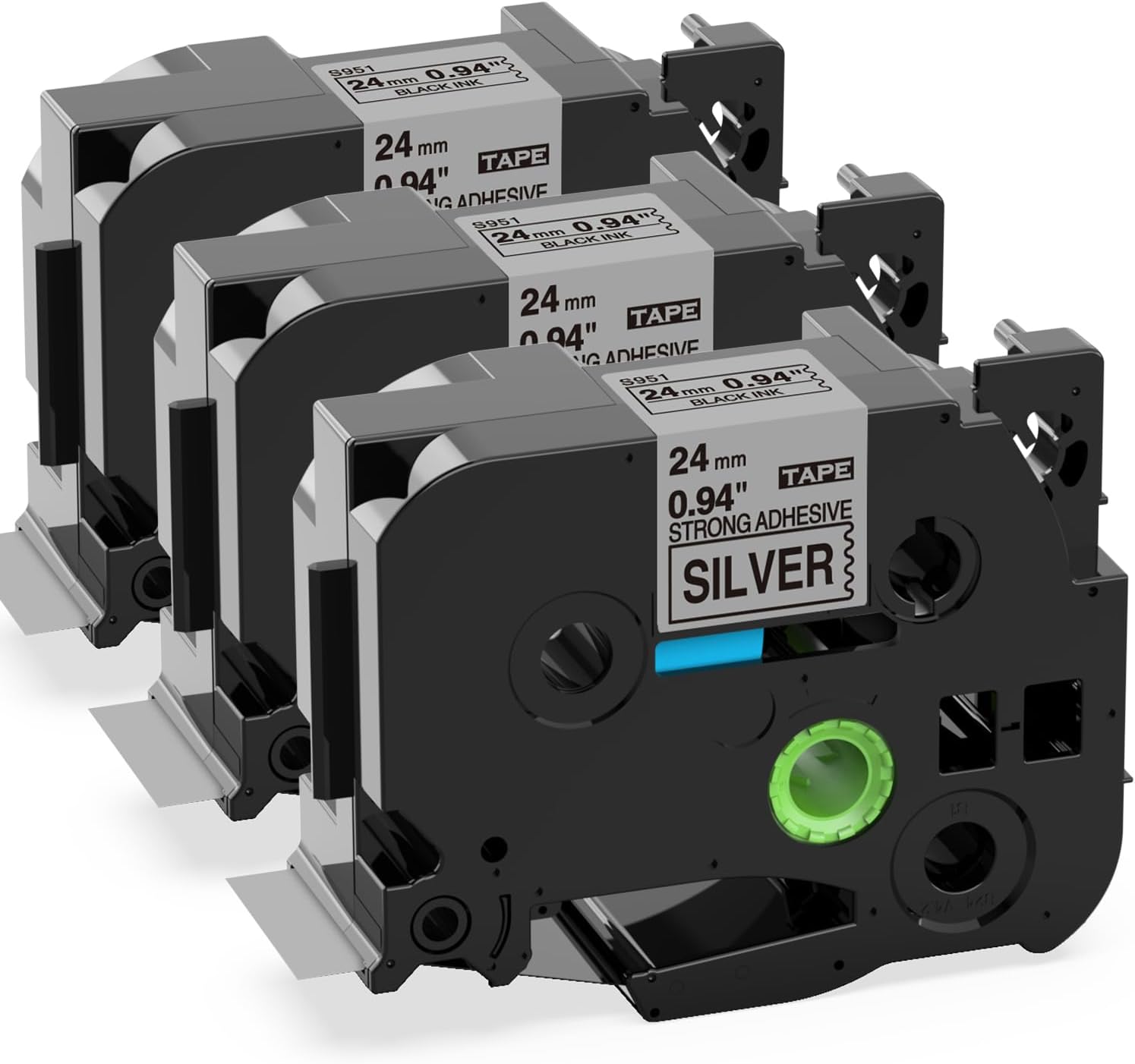 - Color: Black on Silver, 3-Pack Replacement for TZe-S951 Extra-Strength Adhesive Laminated Tape. Size: 24mm x 8m (0.94 Inch x 26.2 Feet)