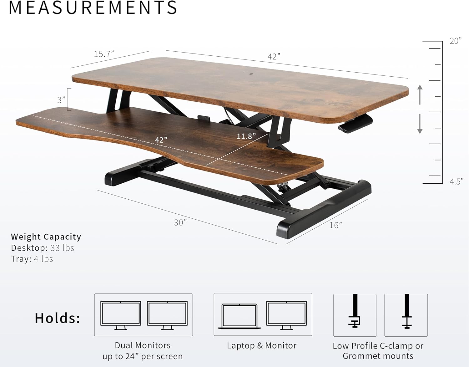 VIVO 42 inch Desk Converter, K Series, Height Adjustable Sit to Stand Riser, Dual Monitor and Laptop Workstation with Wide Keyboard Tray, Rustic Vintage Brown Top, Black Frame, DESK-V042KN